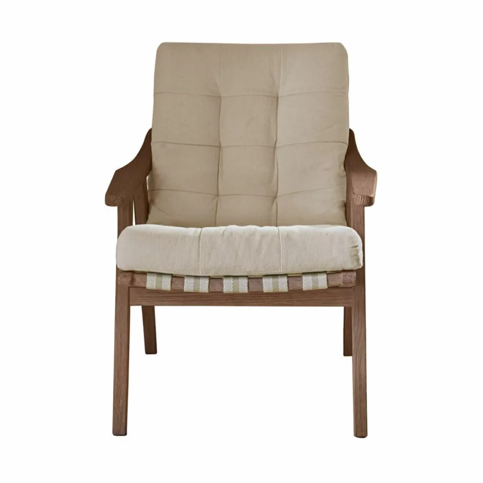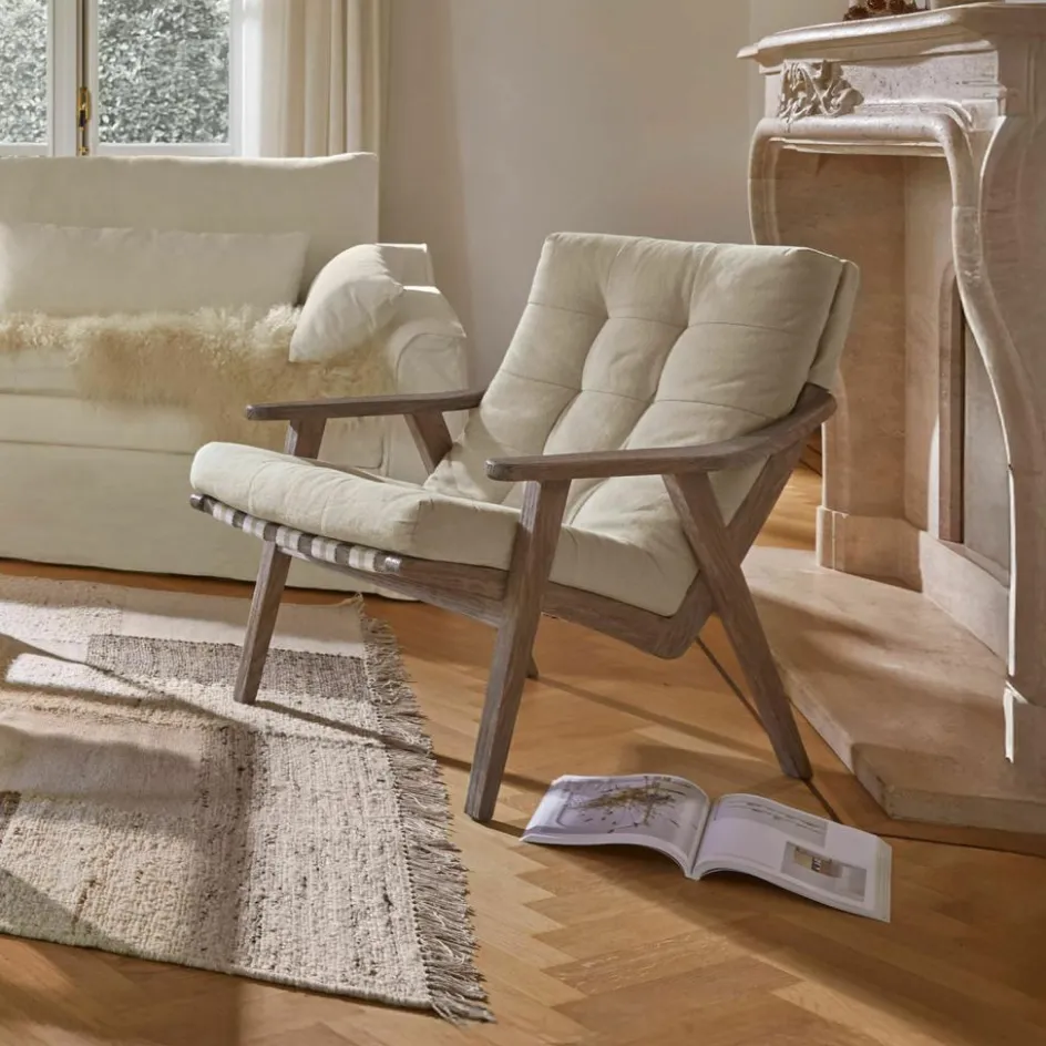 Ein Möbelstück, das Gemütlichkeit ausstrahlt – und das auf den ersten Blick: Der Sessel begeistert mit seiner tiefen Sitzfläche, der außergewöhnlich weichen Polsterung und einer Stoffqualität, die zum Verweilen einlädt. Die abnehmbare Auflage lässt sich über die Lehne stülpen und fixieren, sodass sie selbst bei längerem Sitzen nicht verrutscht. Das markante Gestell aus Eichenholz überzeugt mit seiner offenporigen Struktur und einer wunderschönen, natürlichen Maserung – sie verleiht jedem Exemplar eine ganz eigene, lebendige Note. Ob im Wohnzimmer, Wintergarten oder Lesebereich: Dieser Sessel zieht die Aufmerksamkeit auf sich und bietet zugleich einen Rückzugsort voller Komfort.