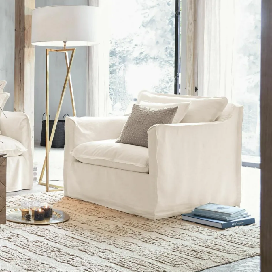 Das klassische Design strahlt Ruhe aus und macht den Sessel kompatibel mit den verschiedensten Wohn-Interieurs, während die weichen Polster zum Hineinsinken einladen. Mit einem Sessel wie diesem hier im Wohnraum, werden Sie nach einem anstrengenden Tag noch lieber nach Hause eilen, denn Sie wissen: Hier können sie einfach wunderbar entspannen und Kraft für den nächsten Tag tanken! Mit seiner stattlichen Größe bietet er viel Platz, um sich in den verschiedensten Positionen hinein zu lümmeln und auch mal die Füße mit hochzunehmen, während Sie spüren, wie die weichen Polster Ihren Körper sanft umfangen und zugleich bequem stützen. Diesen außergewöhnlichen Komfort kann Ihnen der Sessel natürlich nur bieten, weil er von einem Designer geschaffen wurde, der sein Handwerk wirklich versteht. Das solide Grundgestell besteht aus stabilem Holz, für den Komfort der Sitzfläche sorgt eine hochwertige Polsterung, während bei den Sitz-, Rücken- und Kuschelkissen echte Entenfedern mit für die wunderbare Weichheit sorgen. Für die angenehme Haptik ist der Bezugsstoff aus einem hochwertigen Baumwolle-/Leinen-Mix verantwortlich, der dem Sitzmöbel auch die frische Anmutung verleiht. Der Stoff ist an den Enden wundervoll eingefasst von einfachen wie wirkungsvollen Ziernähten. Und natürlich wurde auch an die Alltagstauglichkeit gedacht. Das heißt, die Sessel- und Kissenbezüge können bei Bedarf abgezogen werden.