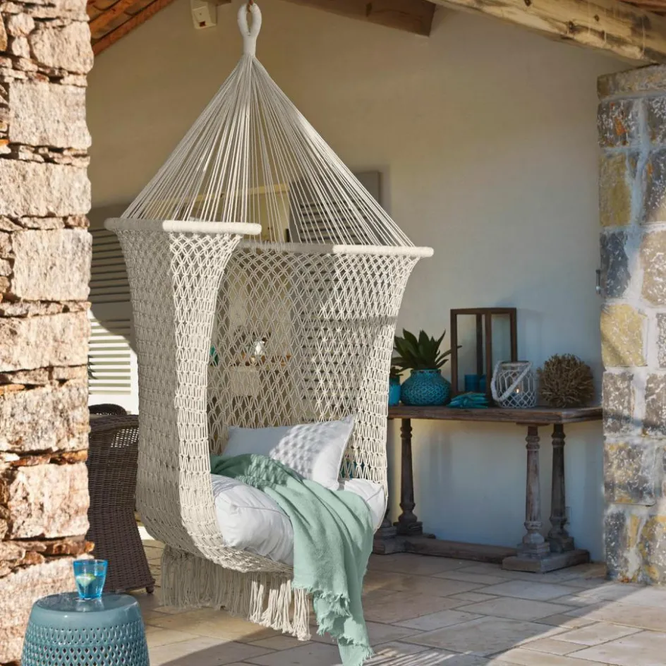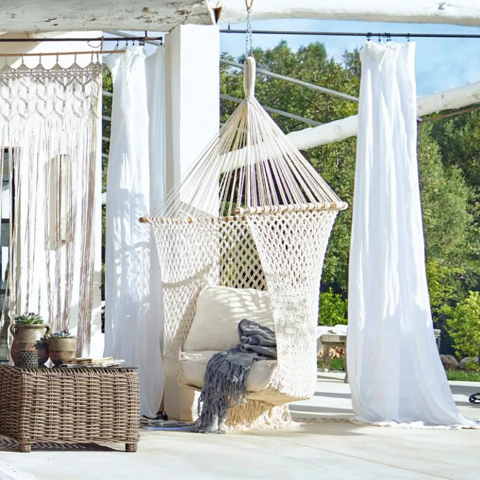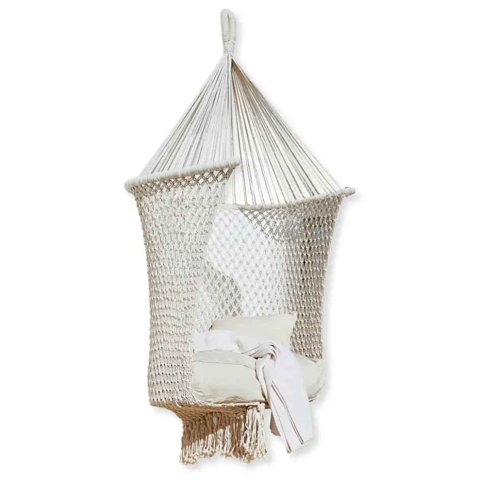 Einfach einmal Auspannen − das ist mit diesem Hängesessel ein bequemer Genuss. Hier kommen auch Puristen voll auf ihre Kosten. Der Hängesessel verfügt über eine Öse, an der Sie ihn einfach aufhängen können. Ob an einem rustikalen Fachwerkbalken, unter Ihrem Lieblingsbaum, auf der Terrasse oder einfach in Ihrem Wellnesszimmer, dieses Design ist geschaffen für pure Genießer. Das runde Sitzkissen und das rückenstabilisierende Rückenkissen sind im Lieferumfang enthalten. Die Kissen sorgen für einen sehr angenehmen Sitzkomfort, während Sie in Ihrem Hängesessel leicht hin und her schwingen. So erleben Sie fast schwerelose Entspannung, die den Stress des Alltags schnell vergessen lässt. Das feine Makramee ist traditionelle Handarbeit, die in diesem Hängesessel mit viel Geschick und Erfahrung zu Ihrer vollen Blüte gelangt. Stilvoll und aus reiner Baumwolle gefertigt lässt sie den Wind sanft hindurchgleiten. Das ist im Garten ein besonders angenehmes Gefühl. Außerdem bezaubert der Hängesessel seine Umgebung mit seinem hellen und leichten Design, das an Urlaub, Palmen und Strände erinnert. Die eingebunde Eisenstange verstärkt diesen Eindruck und sorgt nebenbei für eine gute formstabile Qualitätsarbeit, die bis zu 80 kg tragen kann. Erstaunlich, denn dagegen ist der Hängesessel selbst ein Federgewicht.
