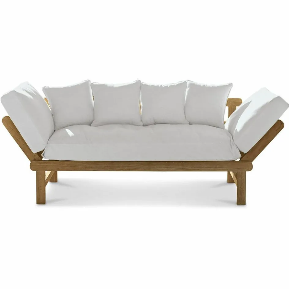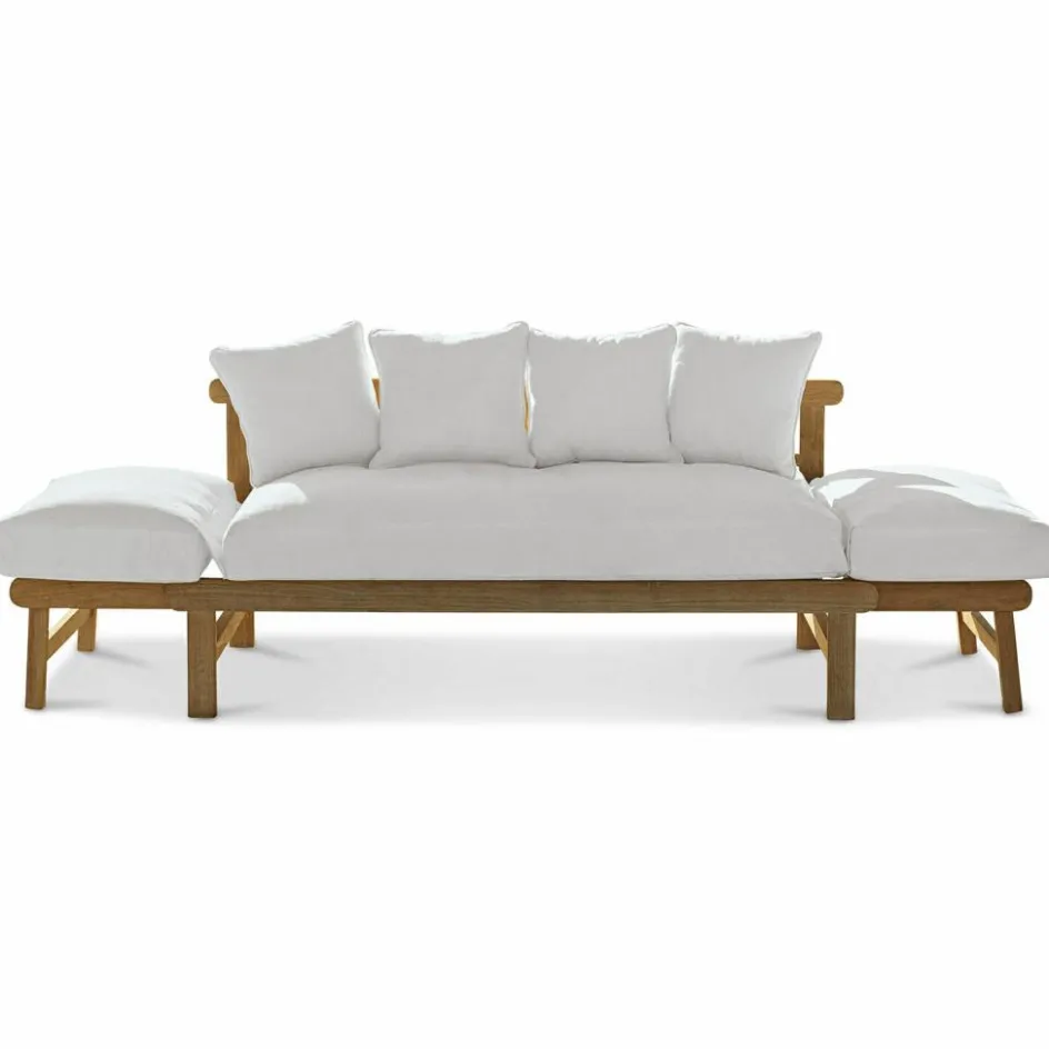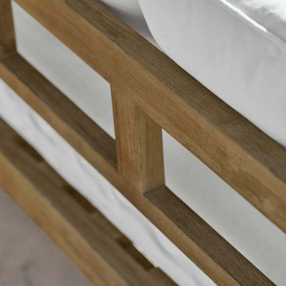 Perfektion mit allen Finessen: Dieser Lounger ist nicht nur ein Inbild hohen Stils, er ist auch meisterlich durchdacht. Zunächst überzeugt seine smarte Funktionalität: Ein Handgriff und die seitlichen Lehnen sind hoch oder runter geklappt. Wenn Sie sich einfach einmal ausstrecken und die Seele baumeln lassen möchten, machen Sie das Schmuckstück zu einer langen Bank. Hochgeklappt können Sie es sich mit einem Buch in der Sitzecke bequem machen oder auch den Kopf auf einer der Lehnen wie auf einem Kissen hochlegen. Mit dabei sind vier bequeme Rückenkissen und ein dreigeteiltes Sitzkissen, die zusammen für Bequemlichkeit rundum sorgen. Hinzu kommt das Material: Im Einsatz ist hochwertiges Teakholz, das nicht nur wunderschön, sondern auch extrem widerstandsfähig und wetterfest ist. Der Bezug aus weichen und wasserabweisenden Olefinfasern machen den Lounger auch zu einem verlässlichen Eye-Catcher und Compagnon für den überdachten Außenbereich. Denn Olefinfasern sind ein sehr weicher Stoff, der dennoch robust, leicht wasserabweisend und schimmelresistent ist. Unter dem Bezug befindet sich zudem eine innovative Polsterung: Die Quick-Dry-Polsterung wurde in Deutschland entwickelt. Sie ist besonders offenporig designt. Das sorgt dafür, dass Wasser optimal und vor allem schnell abfließen kann. Zudem sorgen die offenporige Struktur für eine dauerhafte Luftzirkulation. Auf diese Weise bildet sich keine Staunässe und die Polsterung kann innerhalb kürzester Zeit trocknen. Das macht unsere Polster einfach perfekt für den Einsatz auf Terrasse und Balkon.