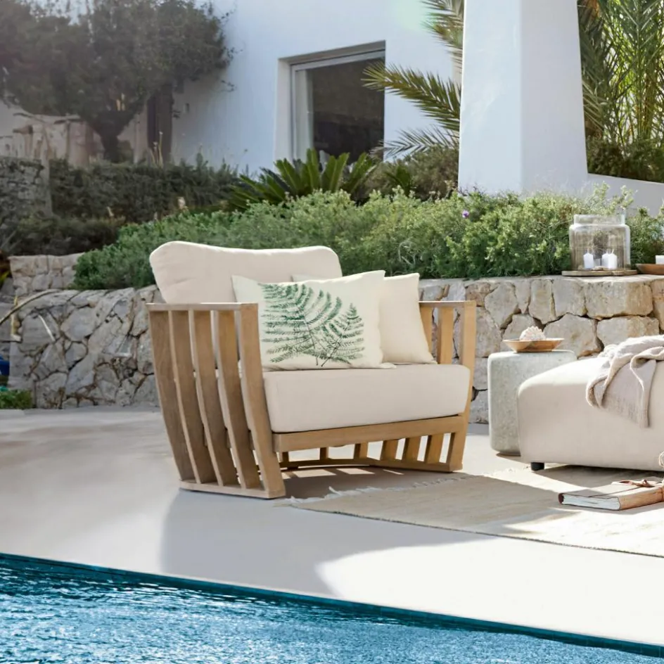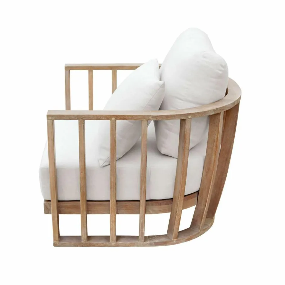 Bei vielen Sesseln muss sich das Holz damit begnügen, unsichtbar unter der Polsterung für die Stabilität des Sitzmöbels zu sorgen. Hier aber darf es sich in voller Schönheit präsentieren und dem Sessel den charakteristischen Look geben. Massive Streben aus hochwertigem Eukalyptusholz bilden eine elegant geschwungene, runde Form, in der man äußerst bequem sitzt und wunderbar entspannen kann. Unter Insidern wird ein solcher Sessel als Banana chair bezeichnet, denn die umlaufende Lehne, die gleichzeitig als Arm- und Rückenlehne dient, erinnert Fantasiebegabte an eine Banane. Ein dezentes White-Washed-Finish betont die typische Maserung und lässt das Holz wie von der Sonne gebleicht aussehen. Und natürlich trägt das Holz das FSC®-Siegel, das garantiert, dass es aus nachhaltiger Waldwirtschaft stammt, bei der auch auf die Erhaltung der Ökosysteme und Artenvielfalt geachtet wird. Für den luxuriösen Sitz-Komfort im Sessel ist außerdem das Kissen-Trio zuständig, das aus je einem üppig gepolsterten Sitz-, Rücken- und Zierkissen besteht. Als Bezugsstoff für die Kissen wurde ein hochwertiges, strapazierfähiges Polyestergewebe gewählt. Und weil die Bezüge abziehbar und waschbar sind, werden Sie die schönen Stunden in diesem Sessel noch relaxter genießen.
