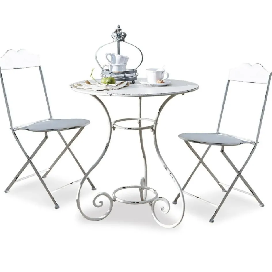 Diese charmante Sitzgruppe entspricht klassischen Vorbildern des 19. Jahrhunderts. Man könnte tatsächlich meinen, es handle sich um antike Fundstücke aus Frankreich. In Sachen Material und Verarbeitung gleichen Tisch und Stühle den Originalen quasi bis aufs Haar. Sie werden aus reinem Eisen gefertigt und mit einem aufwendigen Antik-Finish veredelt.