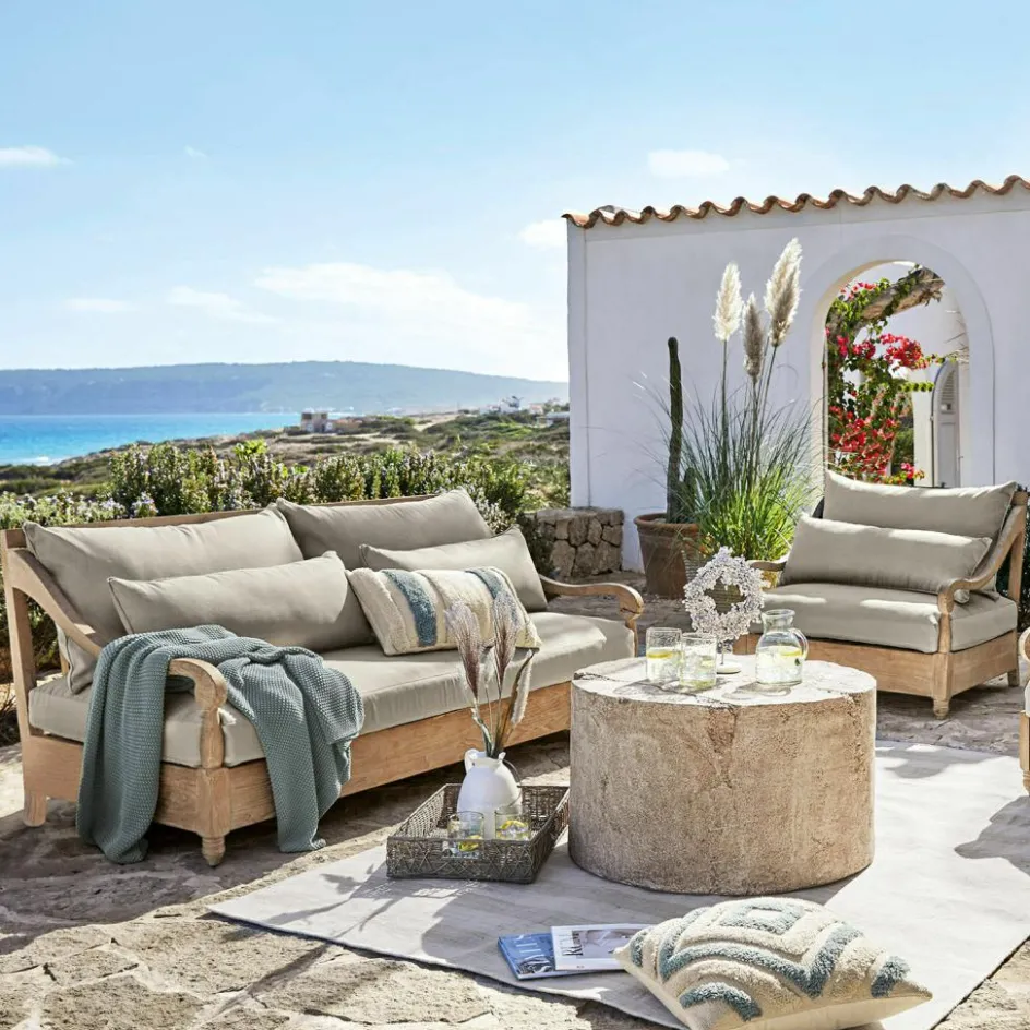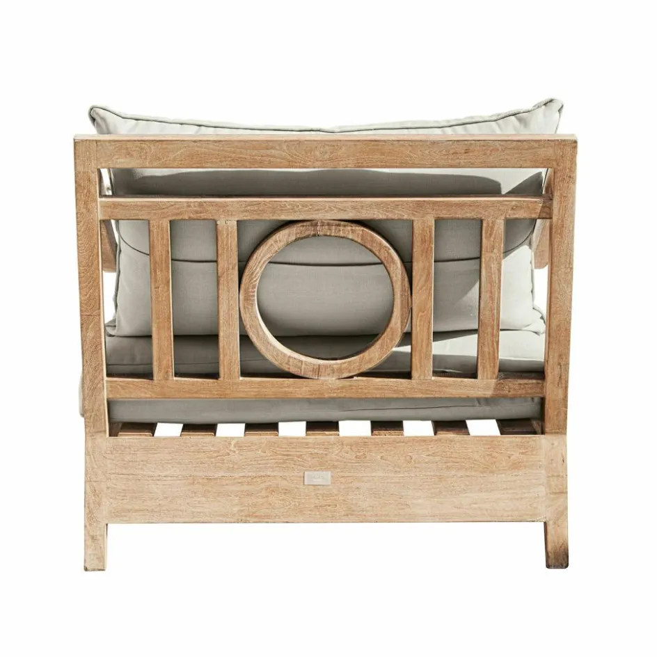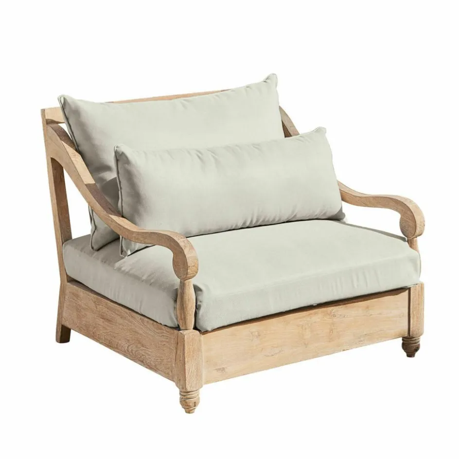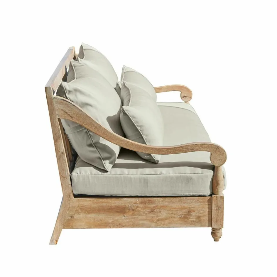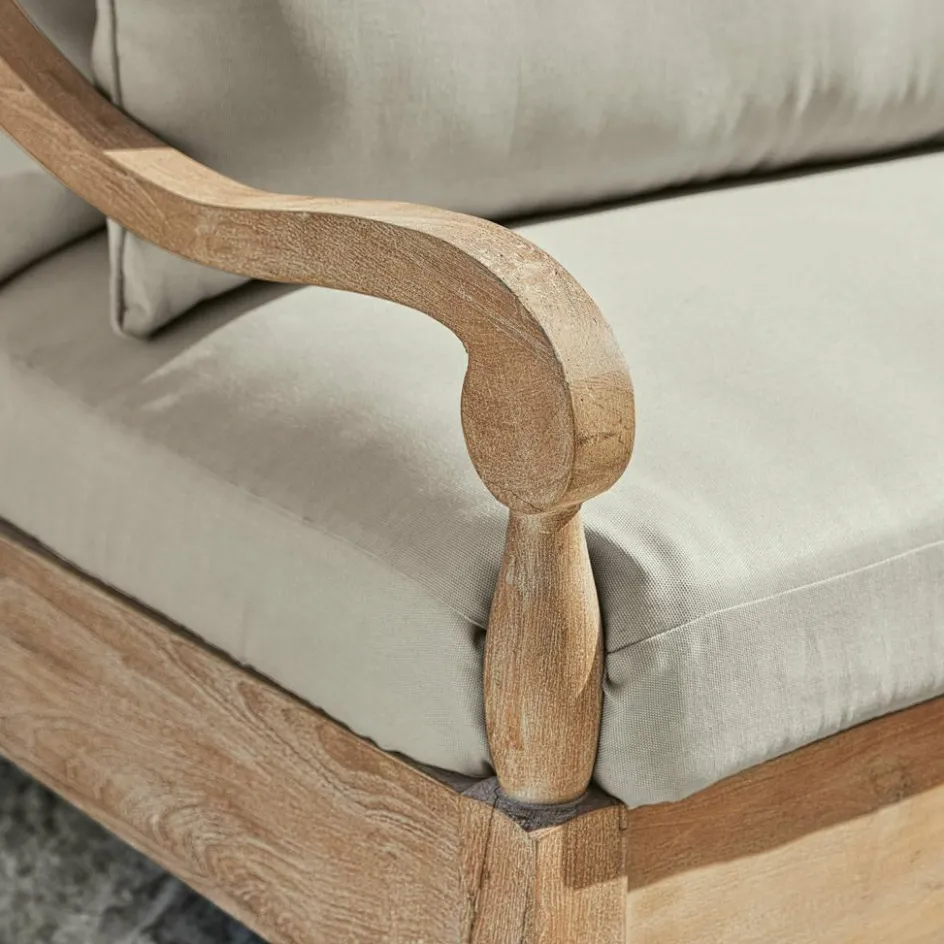 Wenn sich am Morgen ein himmelblauer Sommerhimmel über Ihrem Garten wölbt, wissen Sie, dass Sie jetzt wieder einen jener kostbaren Tage erleben werden, an denen sich entspanntes Urlaubs-Feeling einstellt, sobald Sie die Terrasse betreten. Vielleicht nehmen Sie schon Ihren Cappuccino in der Sitzgruppe ein, vielleicht gönnen Sie sich am Nachmittag ein gemütliches Stündchen auf dem Sofa, auf jeden Fall aber lassen Sie den Tag dort ausklingen, solo, zu zweit oder mit Gästen. An der heiter gelösten Stimmung jener Stunden hat die Sitzgruppe einen nicht unerheblichen Anteil, denn sie verbreitet das stilvolle Flair eines gastlichen Hauses und verwöhnt alle mit luxuriösem Sitzkomfort. Und wie die weichen Sitz- und Rückenpolster zum Platznehmen und Verweilen einladen, zeugen die aufwendig gearbeitete Rückseite, die elegant geschwungenen Armlehnen und die liebevoll gedrechselten Füße von der Passion des Künstlers für sein Handwerk. Und mit dieser Sitzgruppe hat er ein Meisterstück geliefert. Das wiederaufbereitete Teakholz sorgt nicht nur für die gute Wetterbeständigkeit der Sitzgruppe, sondern kann durch das dezente White-Washed-Finish auch eine besonders ausdrucksstrake Maserung zeigen. Die Kissen haben einen Outdoor-geeigneten Bezug mit Abperleffekt, was ihn also wasserabweisend macht. Die Bezüge lassen sich bei Bedarf auch gerne abnehmen. Noch ein praktisches Detail: Die Sitzkissen werden mit Klettbändern an den Latten fixiert.