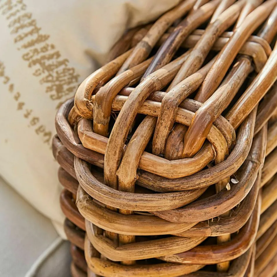 Loungen, entspannen, Seele baumeln lassen, chillen – es gibt viele Ausdrücke für das süße Nichtstun. Ruhige Momente, in denen der Alltagsstress keine Chance hat, während Sie ganz komfortabel auf diesem Sofa ruhen. Mal gemütlich in eine Ecke gekuschelt, mal die Beine auf der integrierten Récamiere genussvoll ausgestreckt. Mit diesem Sofa zieht ein zeitlos eleganter Klassiker bei Ihnen ein, der Ihren Wohnbereich mit exklusivem Flair bereichern wird. Prägnanter Blickfang ist das Geflecht aus extra dicken, echten Rattan-Trieben. Ein Geflecht, dessen Herstellung auch eine Herausforderung für den Korbflechter war. Denn Rattan wächst zwar schnell, die Triebe sind aber – anders als z. B. bei Bambus – nicht hohl, sondern massiv. Zusammen mit dem unsichtbaren Gestell aus massivem Mahagoniholz haben Sie mit diesem Sofa ein Möbelstück, das viele Jahre beste Stabilität und Haltbarkeit garantiert. Für den eleganten Lounge-Charakter sorgen auch die komfortablen Polster mit dem fein eingewebten Fischgrät-Design und den markanten Kedern. Die Bezüge bestehen aus einem strapazierfähigen, waschbaren Polyester-/Baumwolle-Mix.