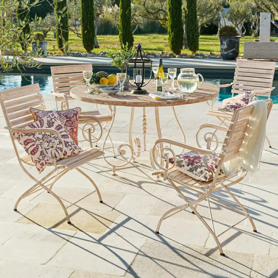 Ein Schmuckstück von ausgesuchter Schönheit. Der edle, hochwertige Stuhl besteht aus wertvollem Teakholz mit feinem White-Wash-Finish. Ein gemütliches Sitzkissen aus robustem Olefin ist schon dabei. Es ist auch farbecht und wetterfest. Das Gestell aus Eisen ist sehr hübsch geschwungen und sorgt für eine romantische Note. Die Armlehnen bieten besonderen Sitzkomfort. Das Design hat einen Hauch Pariser Chic und eignet sich für alle, die es nostalgisch mögen. Zu einem Ambiente im Shabby-Chic gewinnen Sie hiermit innen wie außen ein ideales Accessoire, an dem Sie lange Freude haben. Solo oder als Sitzplatz am Tisch, hiermit wird die kostbare Freizeit gleich noch angenehmer und erholsamer. Zudem setzen Sie einen optischen Akzent voller Stil und Klasse.