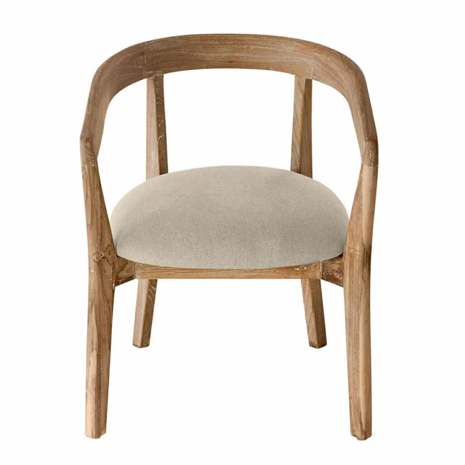 Natürliche Materialien und zeitlose Formgebung machen diesen Stuhl zu einem besonderen Möbelstück. Das wiederaufbereitete Teakholz begeistert mit seiner einzigartigen Oberfläche, die durch ein gebürstetes Grau und eine feine Kalkung die charakteristische Maserung intensiv zur Geltung bringt. Die geschwungene Lehne verleiht ihm eine sanfte Dynamik, während der gepolsterte Sitz mit seinem widerstandsfähigen Bezug für Komfort sorgt. Ob am Esstisch, im Wohnzimmer oder als charmanter Akzent im Arbeitsbereich – dieser Stuhl verbindet Ästhetik mit Funktionalität und bringt eine besondere Leichtigkeit in den Raum.
