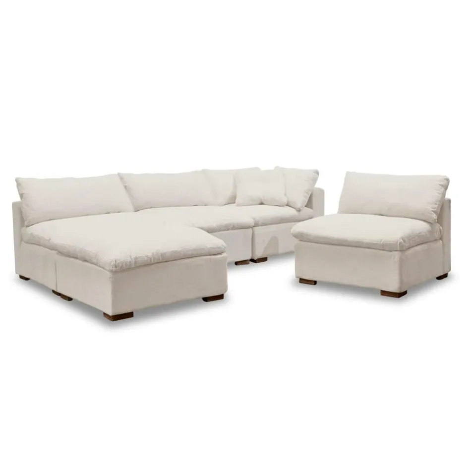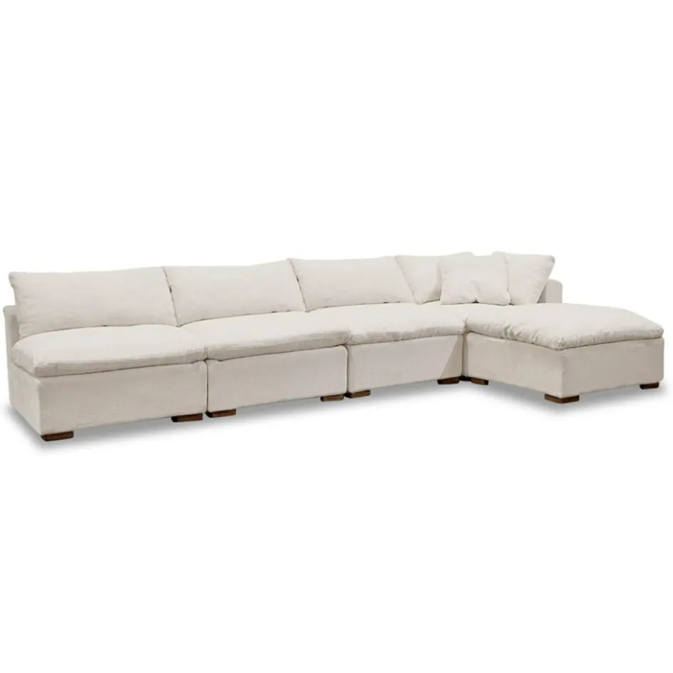 In Stil und Design ist dieses Sofa ein echter Klassiker. Zudem bietet es nicht nur Qualität auf ganzer Linie, sondern ausreichend Komfort für die kultivierte Entspannung. Seine einladende Größe und die elegante Geradlinigkeit machen es zum Allroundtalent in vielen Einrichtungskonzepten. Ein Ecksofa, drei Sessel und ein großzügiger Hocker, der auch als Ablage dienen kann, gehören zu den Komponenten des Ganzen, welche nach Wunsch und Raumsituation einzeln gestellt oder individuell kombiniert werden können. Jedes Element ist rundum soft gepolstert und mit natürlichem Bezug mit hohem Leinenanteil überzogen. Durch eine Hakenlösung können sie fest miteinander verbunden werden. Die Rücken- und Sitzkissen sind in Stoff und Farbe perfekt angepasst – mit ihrer wunderbar weichen Füllung lassen sie das Sofa sofort zu einer äußerst gemütlichen Wohninsel werden. Nun müssen Sie sich nur noch Zurücklehnen, vielleicht Ihre Beine hochlegen und Ihre Wohlfühl-Momente genießen.