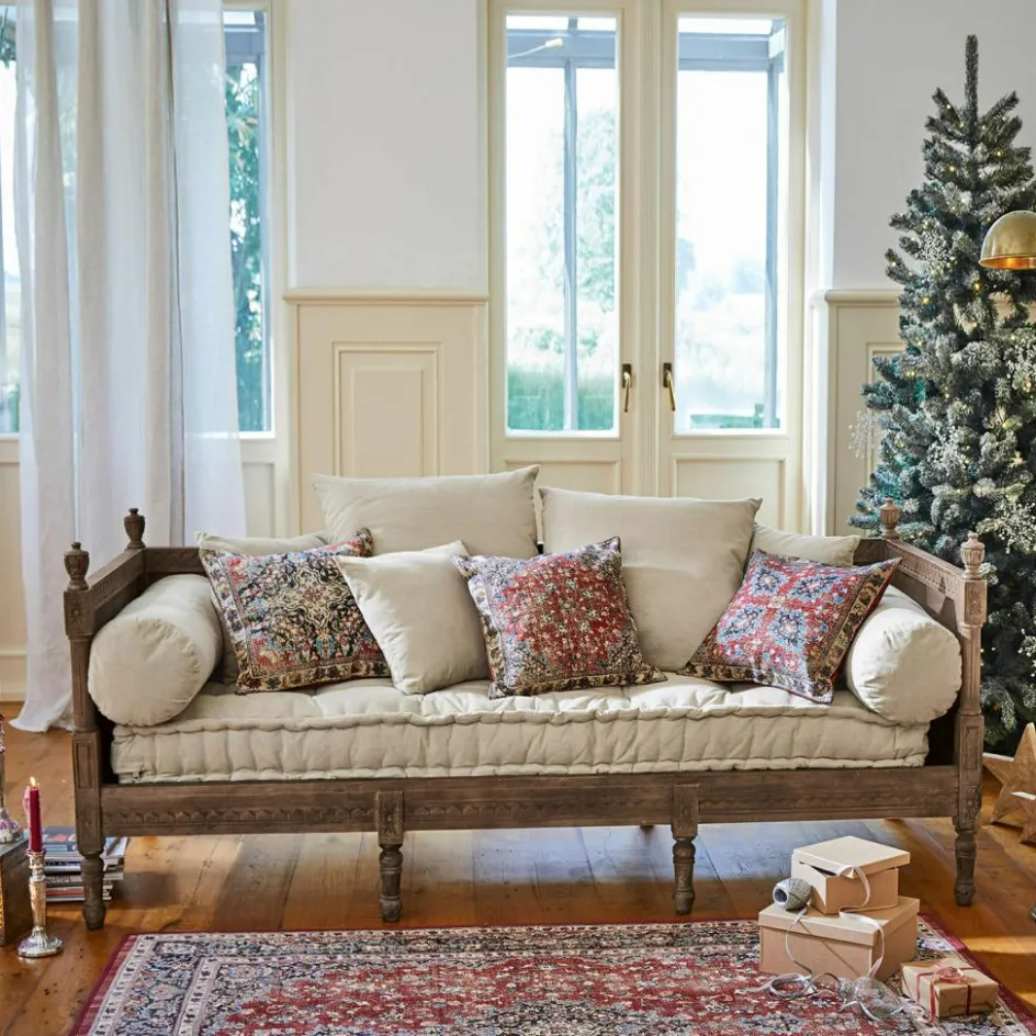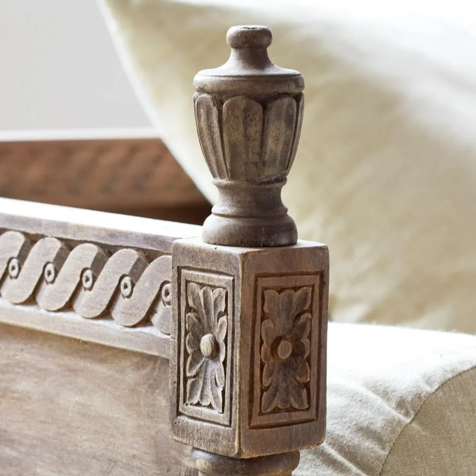 Ein Sofa, das auch in einem marokkanischen Patio stehen könnte! Ornamentale Schnitzereien und die schönen Abschlußknäufe bestimmen den orientalischen Stil. Praktisch auch mal als Gästebett und für die Siesta zwischendurch. Acht Beine sorgen für Stabilität.