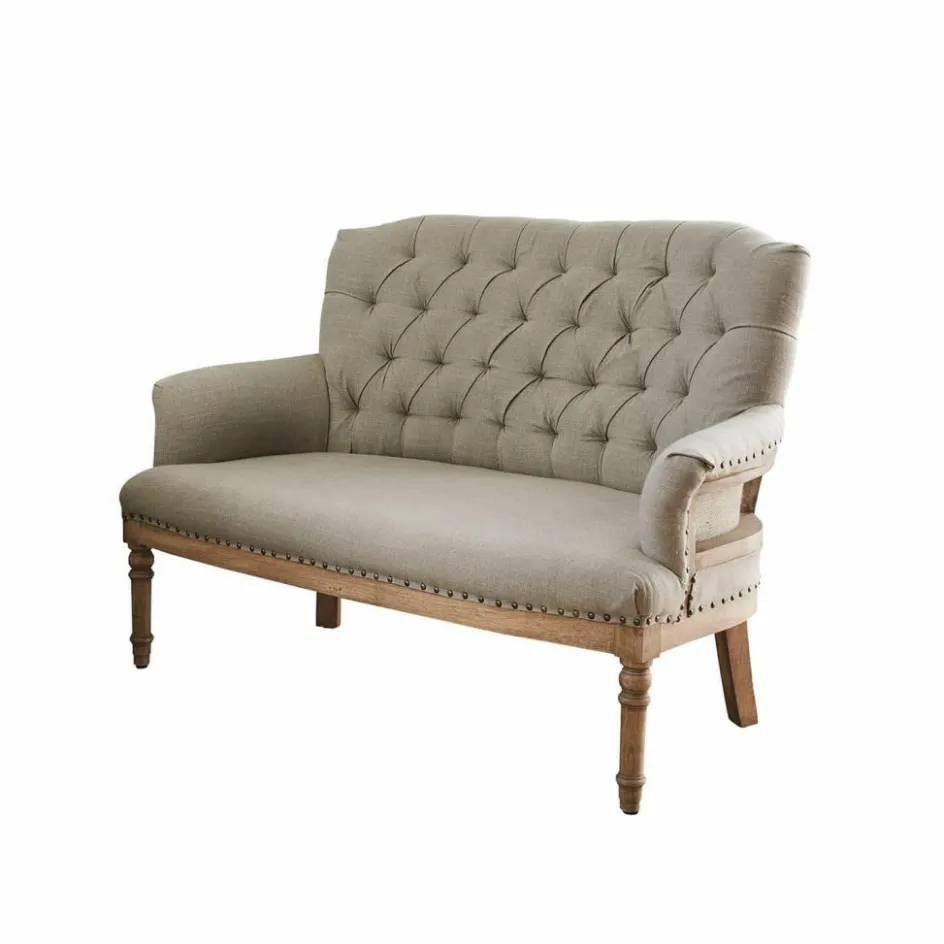 Platz für zwei bietet dieses edle Sofa, das nach englischen Vorbildern von erfahrenen Polsterern gefertigt wird. Sie beherrschen unter anderem die klassische Chesterfield-Steppung mit Polsterknöpfen, die hier die Rückenlehne auf elegante Weise betont. Das Möbel ist weich gepolstert und mit einem robusten und ansprechend strukturierten Webstoff bezogen. Ausgesprochen formschön sind die leicht geschwungenen Lehnen, die wie eine einladende Umarmung wirken. Und die angenehm tiefe Sitzfläche ist so bequem, dass man stundenlang verweilen möchte. Ziernieten aus Messing und das stabile Untergestell aus Mangoholz mit gedrechselten Beinen machen das Bild vollkommen. Vintage-Chic der exquisiten Art – ein stilvolles Schmuckstück für das Wohnzimmer, Gästezimmer oder Kaminzimmer.