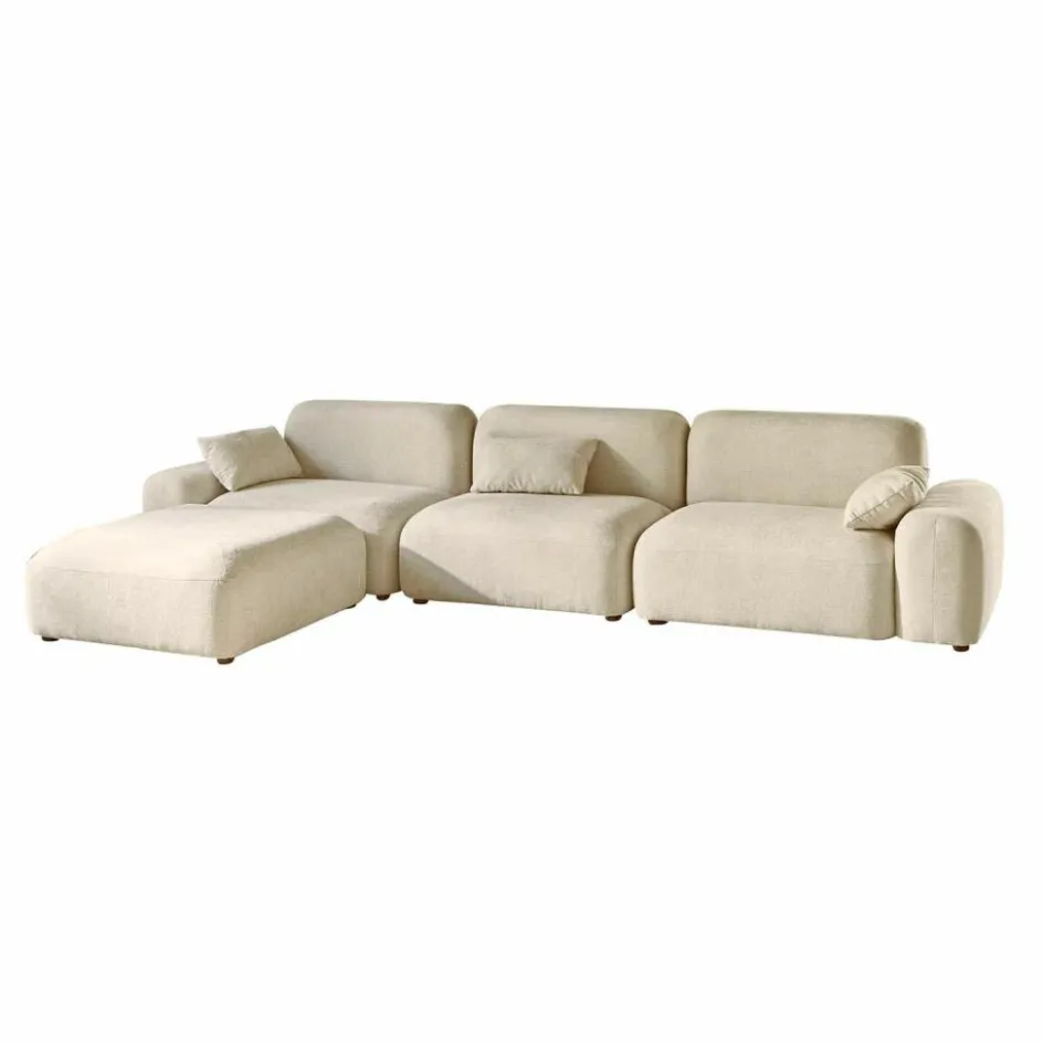Dieses Ecksofa ist mehr als nur ein Möbelstück – es ist ein flexibler Wohlfühlort, der mitdenkt. Die einzelnen Elemente lassen sich ganz nach Belieben arrangieren, und der Hocker kann durch ein cleveres Verbindungssystem an jedem Platz fixiert werden. Ob als großzügige Liegefläche, klassische L-Form oder lockere Wohninsel – Ihrer Kreativität sind keine Grenzen gesetzt. Die angenehm straffe Polsterung sorgt dabei für langanhaltenden Komfort. Ein besonderes Highlight ist der edel strukturierte Stoffbezug, der sich sanft wie feiner Samt anfühlt und gleichzeitig eine dezente Wohnlichkeit verströmt. Ideal für alle, die ihr Wohnzimmer flexibel und stilbewusst gestalten möchten. Mit seinem tiefen, großzügigen Sitz und der niedrigen Rückenlehne bringt dieses Modell die entspannte Lässigkeit urbaner Wohnwelten in Ihr Zuhause.