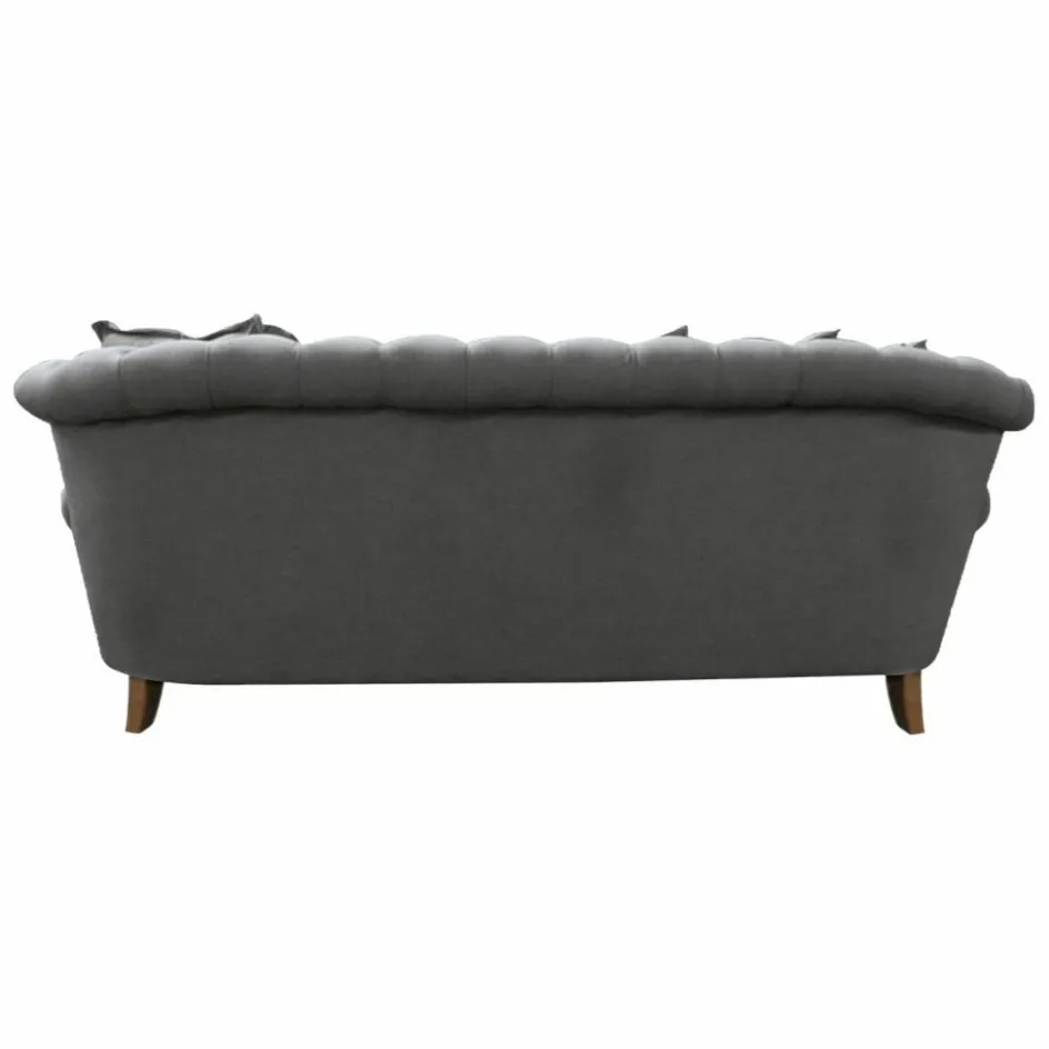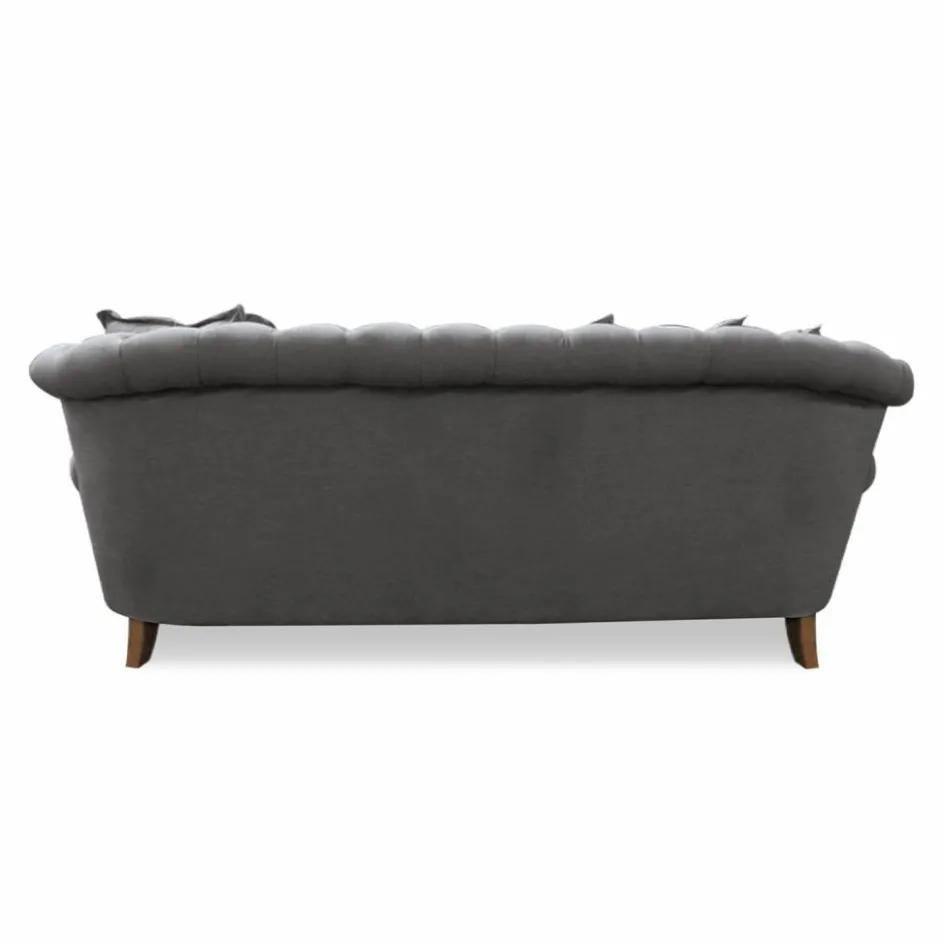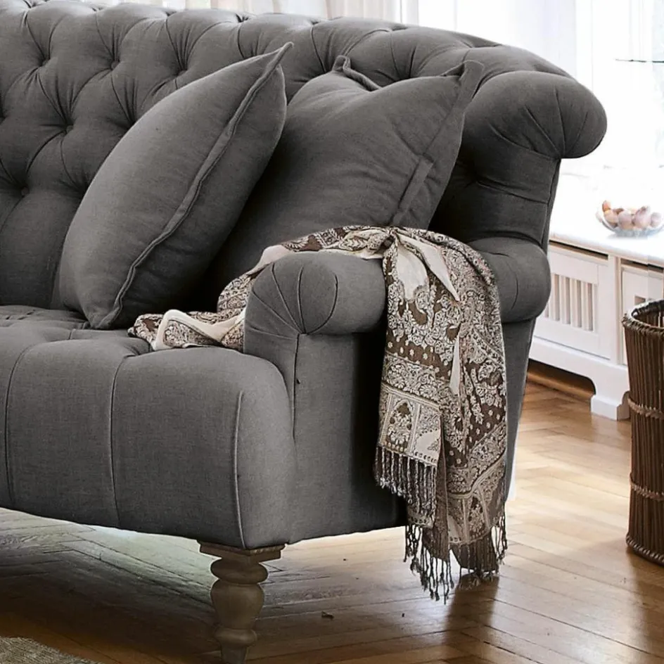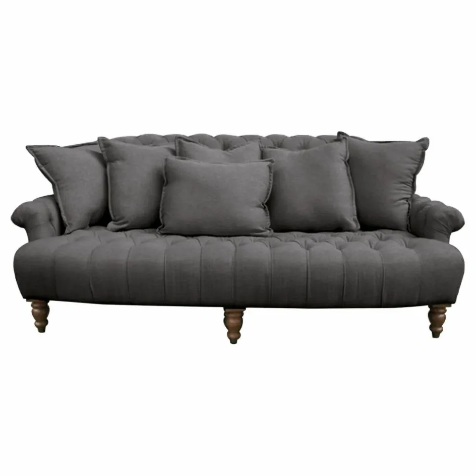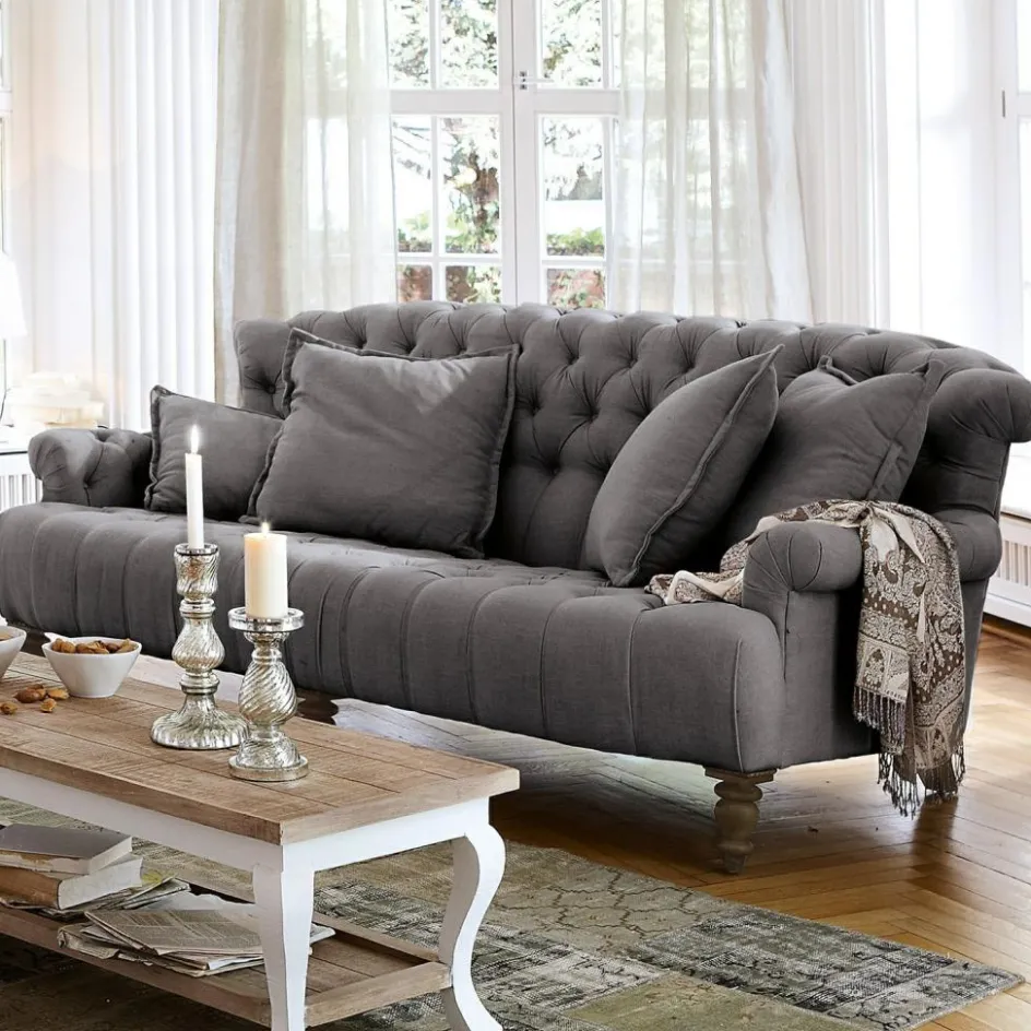 Das Sofa im Chesterfield-Stil nimmt trotz seiner eindrucksvollen Maße den Raum nicht zu sehr ein – wirkt stattdessen leicht und luftig: Dieser Eindruck wird von den fünf beinahe zierlich wirkenden Füßen, die vorderen liebevoll gedrechselt, noch unterstrichen. Die komfortable Polsterung besteht aus einer festen Schaumstoff- und Polyesterfüllung. Der Bezug aus einem pflegeleichten und absolut widerstandsfähigen Leinen-Mix. Zusammen mit dem stabilen Gestell aus Kiefernholz behält die Couch so garantiert in jeder Lebenslage ihre Form und Bequemlichkeit. Das Beste: Gleich sechs zusätzliche Kissen im gleichen Farbton kommen direkt mit zu Ihnen nach Hause.