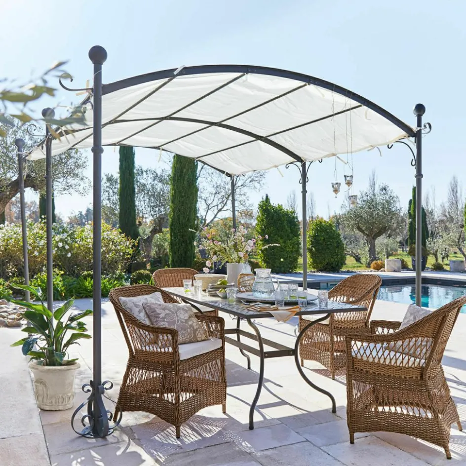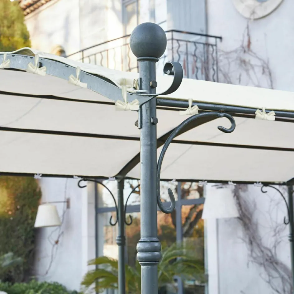 Ein herrlicher Sommermorgen und Sie beschließen, schon das Frühstück unter dem Dach Ihrer neuen Pergola einzunehmen, denn die Atmosphäre dort ist von ganz besonderem Reiz. Den auch Ihre Gäste spüren werden, wenn Sie diese am Abend dort willkommen heißen. Überdacht und doch unter freiem Himmel, offen und dennoch geschützt kreiert die Pergola einen luftigen, klar umrissenen Raum innerhalb Ihrer Gartenanlage, in dem sich jeder wohlig geborgen fühlen wird. Zugleich bildet sie auch einen bezaubernden Blickfang in Ihrem grünen Refugium. Vor allem, weil die filigrane Konstruktion von einer so luftig leichten, schwebenden Eleganz ist, wie sie typisch ist für die traditionelle französische Schmiedekunst. Werden die stabilen Stützen von imposanten Eisenkugeln gekrönt, konnte der Kunsthandwerker nicht widerstehen, die Füße mit zierlichen Ornamenten zu schmücken. Die freitragende Eisenkonstruktion garantiert nicht nur beste Standfestigkeit, sie wurde auch durch eine besonders hochwertige Pulverbeschichtung mit besten Outdoor-Eigenschaften ausgestattet. Das Dach besteht aus modernem Stoffgewebe, das sich ebenfalls mit bester Robustheit und Witterungsbeständigkeit empfiehlt. Genießen Sie an jedem schönen Sommertag, wie die Sonnenstrahlen durch das Dach sanft gemildert werden, während ein laues Lüftchen für optimale Wohlfühltemperatur in der Pergola sorgt. Im Winter raten wir dazu das Dach abzunehmen, damit es Ihnen lange erhalten bleibt.