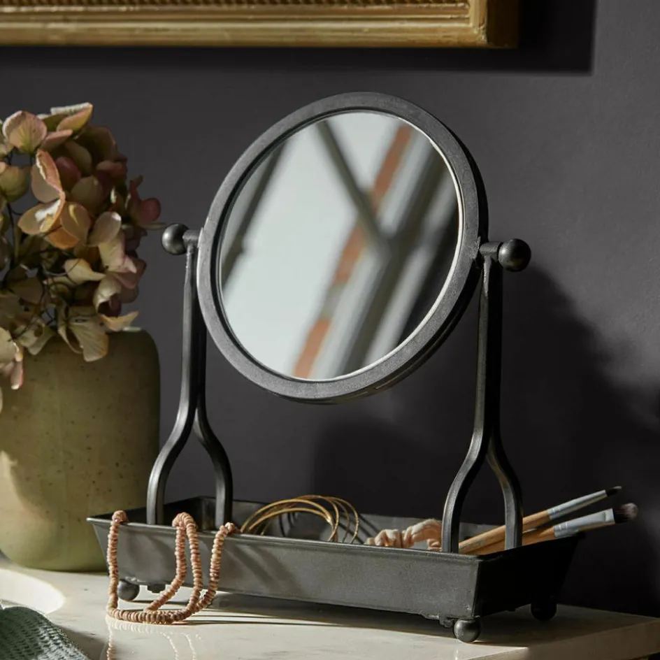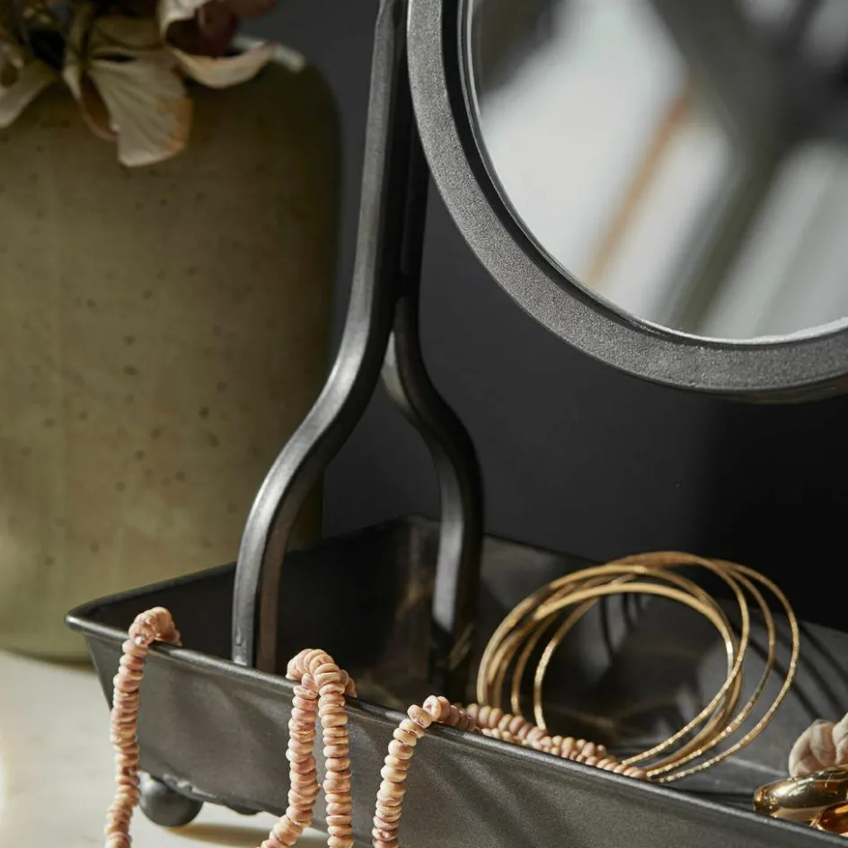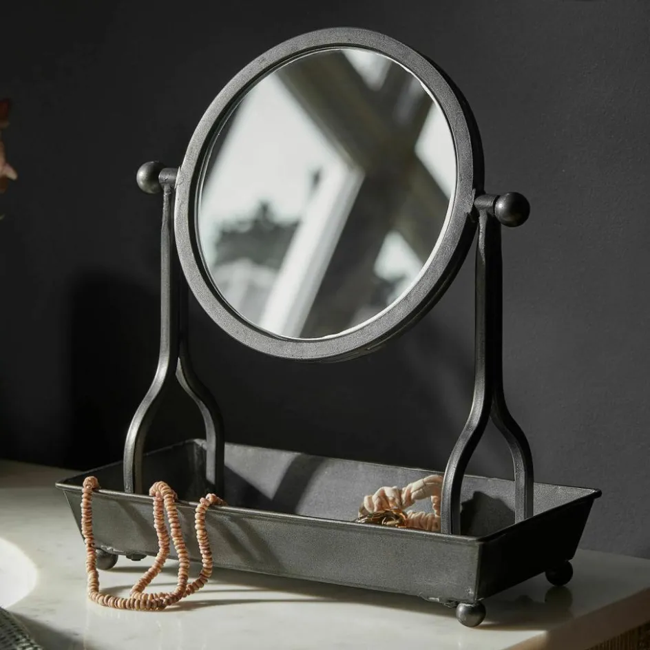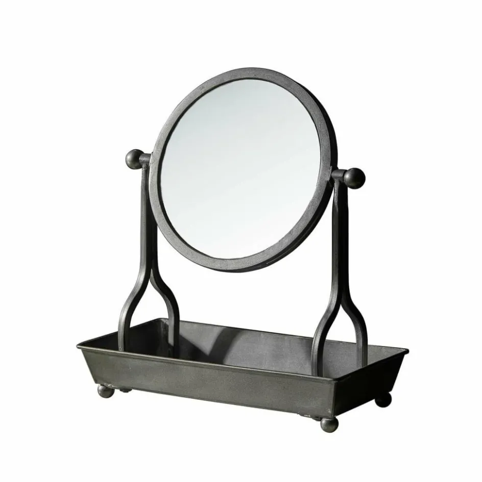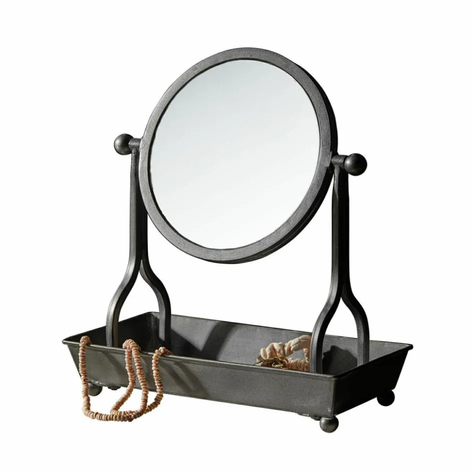 Ein Blick in diesen Spiegel erzählt mehr als nur das eigene Spiegelbild – er erzählt von einem Gespür für Ästhetik und Charakter. Gefertigt aus Eisen mit antikgrauem Finish, wirkt das Design wie ein Fundstück aus einer alten Werkstatt oder einem französischen Boudoir. Die schlichte Form wird durch liebevolle Details ergänzt: Die runde Spiegelfläche ist beidseitig verwendbar und lässt sich stufenlos schwenken und fixieren. Die großzügige Ablagefläche darunter ist ideal, um alltägliche Schönheiten wie Ringe, Haarbürsten oder Lippenstift stilvoll in Szene zu setzen. Ein Accessoire, das in seiner Funktion überzeugt und gleichzeitig ein echtes Stilbewusstsein zum Ausdruck bringt.