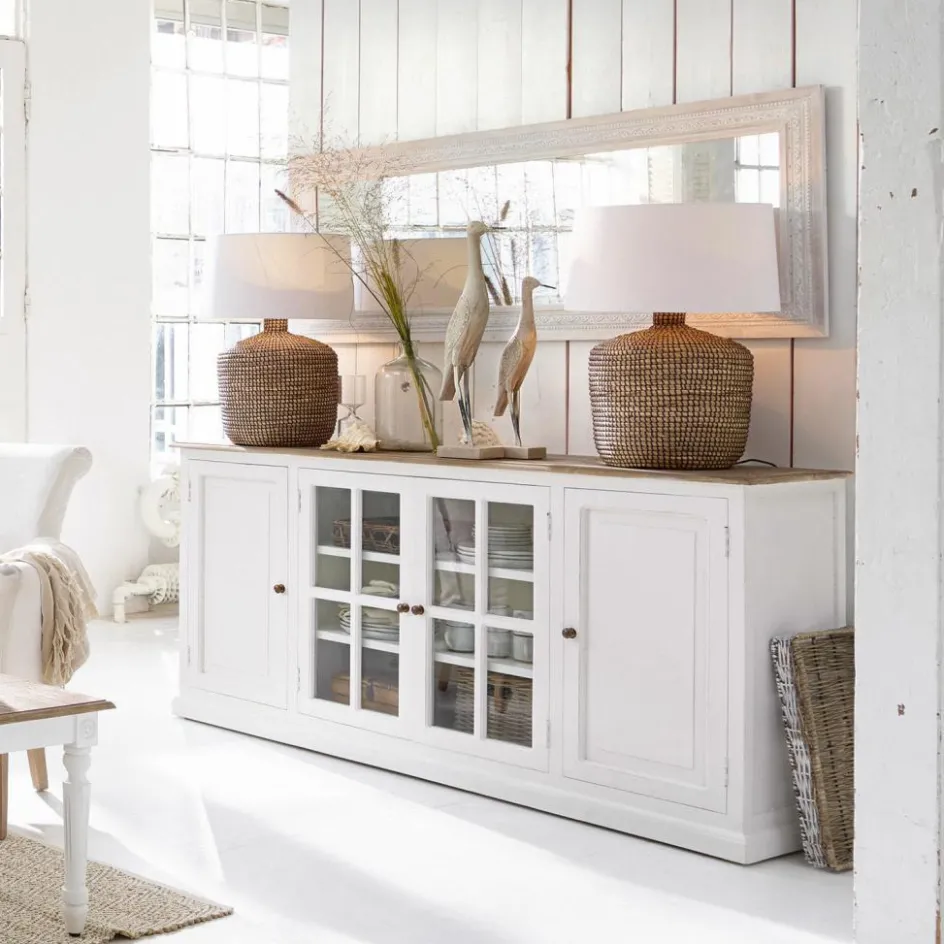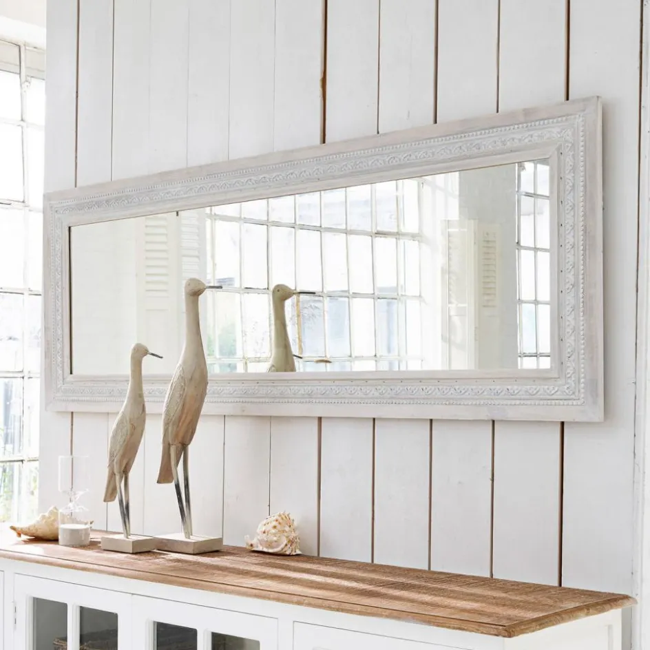 Es gibt Wohn-Accessoires, in die verliebt man sich auf den ersten Blick. Und da sie ihre einzigartige Faszination auch im Laufe eines langen Zusammenlebens nicht verlieren, erwirbt man sich auf diese Weise Partner fürs Leben. Oder zumindest für einen langen, langen Lebensabschnitt. So könnte es Ihnen passieren, wenn Sie diesen Spiegel zu sich in Ihr Zuhause einladen und er dort an einem passenden Platz Ihr Wohnambiente mit seiner beeindruckenden Erscheinung bereichert. Nicht nur Sie, auch Ihre Gäste werden immer wieder die kunstvolle Schnitzarbeit am Spiegelrahmen bewundern müssen, wobei vor allem die Schmuckblende im Mittelpunkt des Interesses stehen wird, die ein wenig an wertvolle Klöppelspitze erinnert. Ein filigranes Kunstwerk, das hier in liebevoller Handarbeit aus Holz entstanden ist. Und zwar aus dem harten Edelholz des Paulowniabaums, das bevorzugt für hochwertige Möbel und Musikinstrumente verwendet wird. Unterstützt wird die Raumwirkung des Spiegels auch durch das Finish in Antik-Weiß, das die nostalgische Anmutung unterstreicht. Dank der 4 Haken auf der Rückseite haben Sie die Wahl, ob Sie den Spiegel hochkant oder quer aufhängen möchten. Über einer breiten Kommode sorgt er in einer waagerechten Position für interessante Raumeffekte, im Flur oder Schlafzimmer bietet er Ihnen in senkrechter Position die Möglichkeit, sich und Ihr Outfit von Kopf bis Fuß zu prüfen.