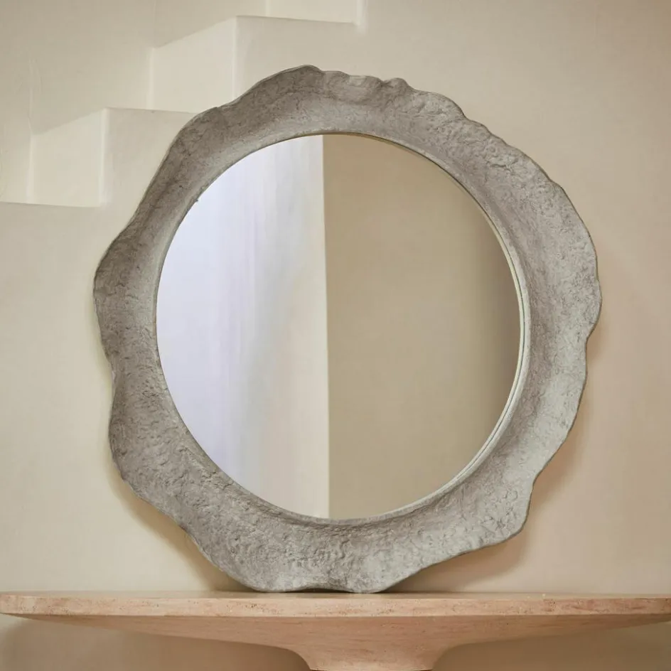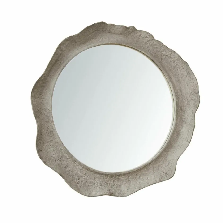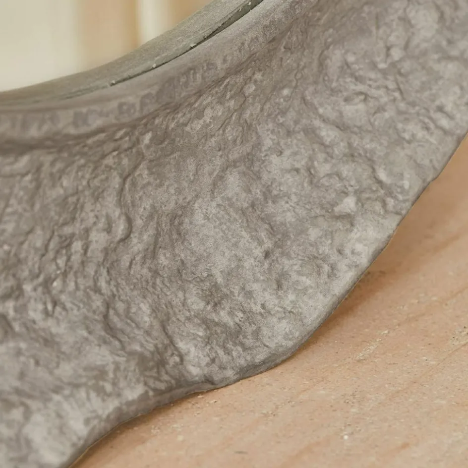 Wie von Wind und Wetter geformt wirkt dieser außergewöhnliche Wandspiegel mit seinem organisch wirkenden Rahmen aus Aluminium. Die Oberfläche ist unregelmäßig strukturiert, erinnert an natürlich verwitterten Stein und erzeugt eine ganz eigene Haptik – rau, lebendig, fast archaisch. Die runde Spiegelfläche steht in spannendem Kontrast zur ursprünglichen Anmutung des Rahmens und macht das Objekt zum Blickfang an jeder Wand. Durch sein Gewicht benötigt der Spiegel eine stabile Befestigung, idealerweise mit Wandaufhängung über Schiene. Ein Stück für Menschen mit einem Gespür für das Besondere.