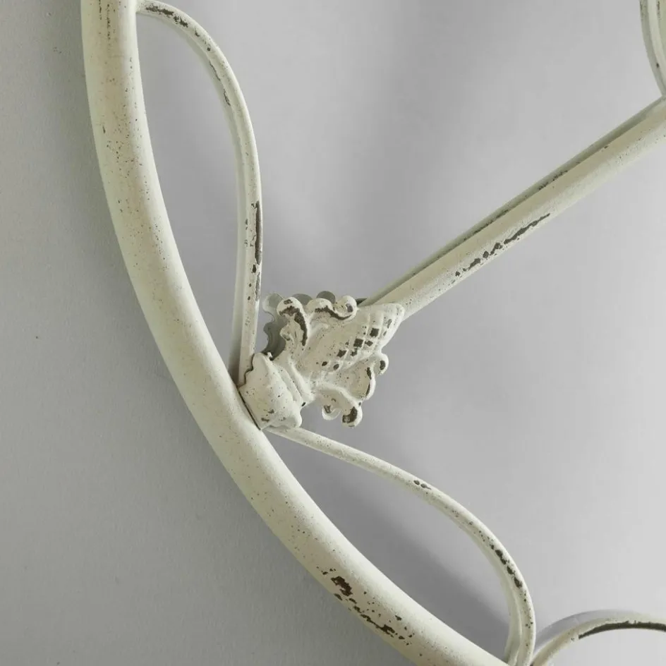 Man könnte meinen, dieser Spiegel sei aus einem alten französischen Palais entnommen – so fein ist sein Charakter, so liebevoll gearbeitet seine Details. Die kreisrunde Form wirkt wie eine stilisierte Fensterrosette, die in acht Segmente unterteilt ist und von zarten Eisenornamenten umspielt wird. Das Antikweiß-Finish mit seinen gezielt eingearbeiteten Gebrauchsspuren verleiht dem Rahmen eine charmant gealterte Ausstrahlung – als hätte der Spiegel schon viele Jahrzehnte an einer Wand verbracht und Geschichten gesammelt. Ob als Blickfang über einer Konsole, als verspieltes Element im Landhausstil oder als Kontrast in modernen Interieurs – dieser Spiegel bringt Licht, Tiefe und eine Prise Romantik in jeden Raum.