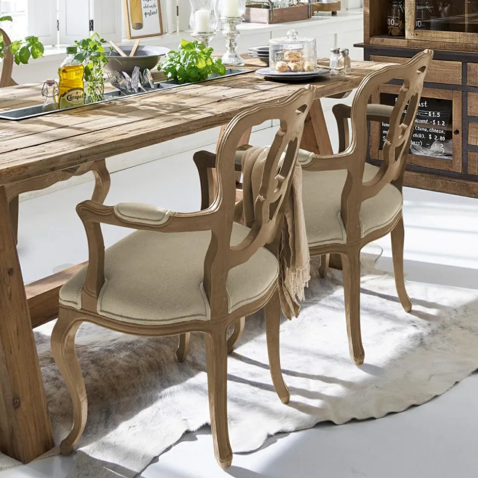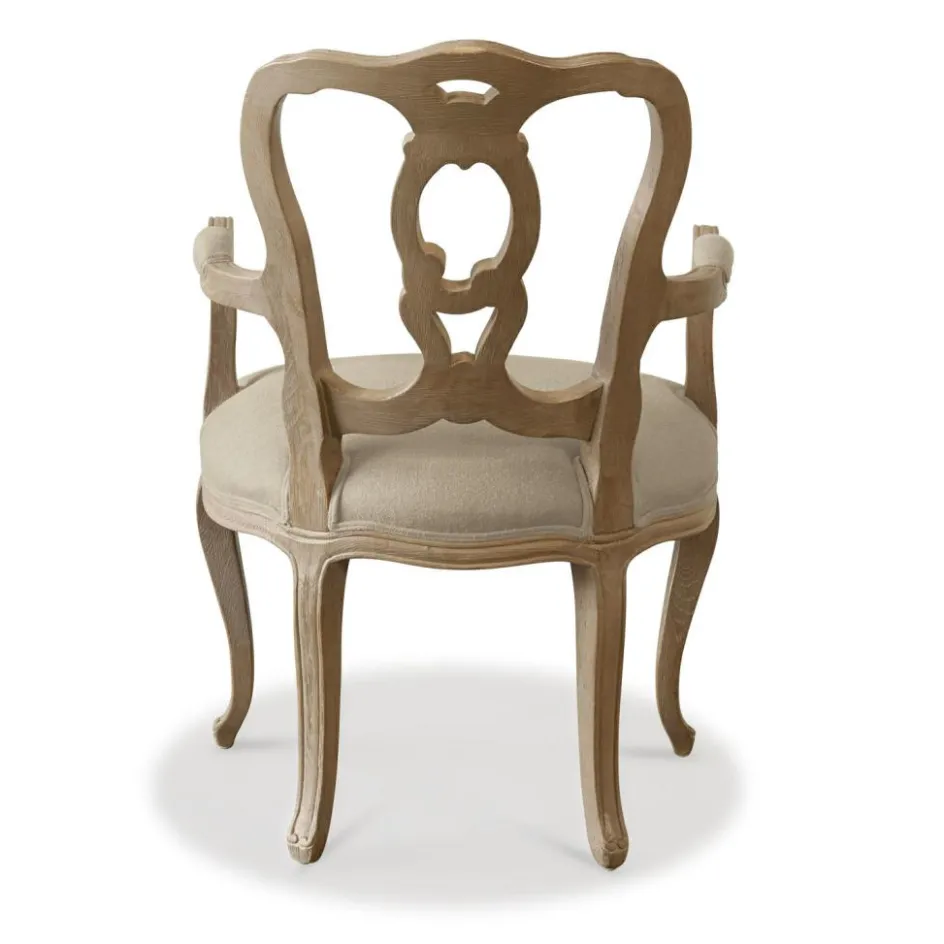 Antiker Charakter mit viel Charme und Patina: Dieser wertvolle, wunderschöne Stuhl bezaubert mit einem kunstvoll geschnitzten Gestell aus edlem Eichenholz mit feinem White-Wash-Finish. Die Bezüge bestehen aus reinem Leinen. Sogar die Lehnen sind für noch mehr Komfort extra bezogen. Machen Sie es sich hierauf im Arbeitszimmer, am Esstisch oder an einem ganz anderen Ort bequem und genießen Sie entspannte Momente und ein ganz reizendes Design, das Ihr Zuhause schmückt. Es zaubert eine Extraportion Nostalgie in jeden Raum und adelt Landhaus-Stil wie Shabby-Chic. Langlebige Qualität, die viele Jahre lang Freude macht und mit der Zeit immer mehr Charakter gewinnt.