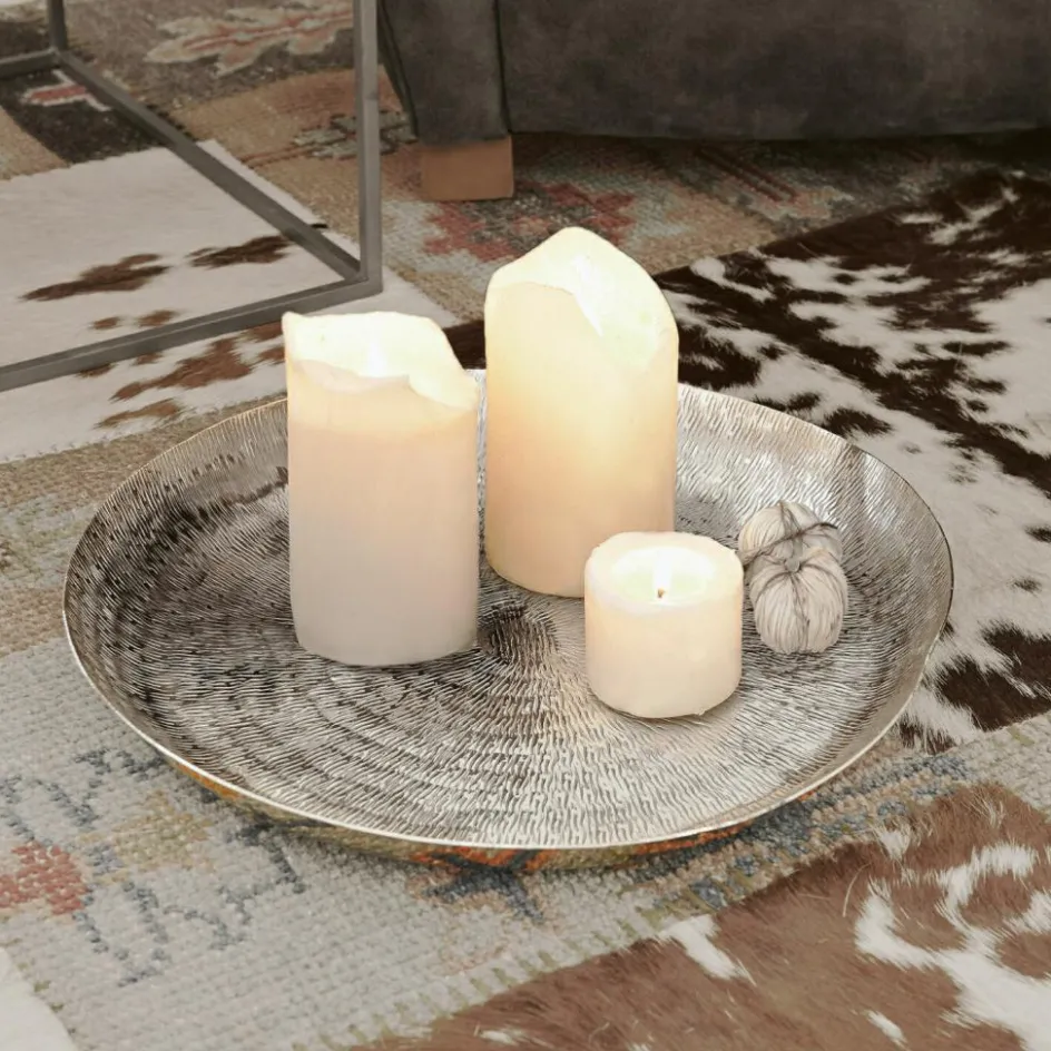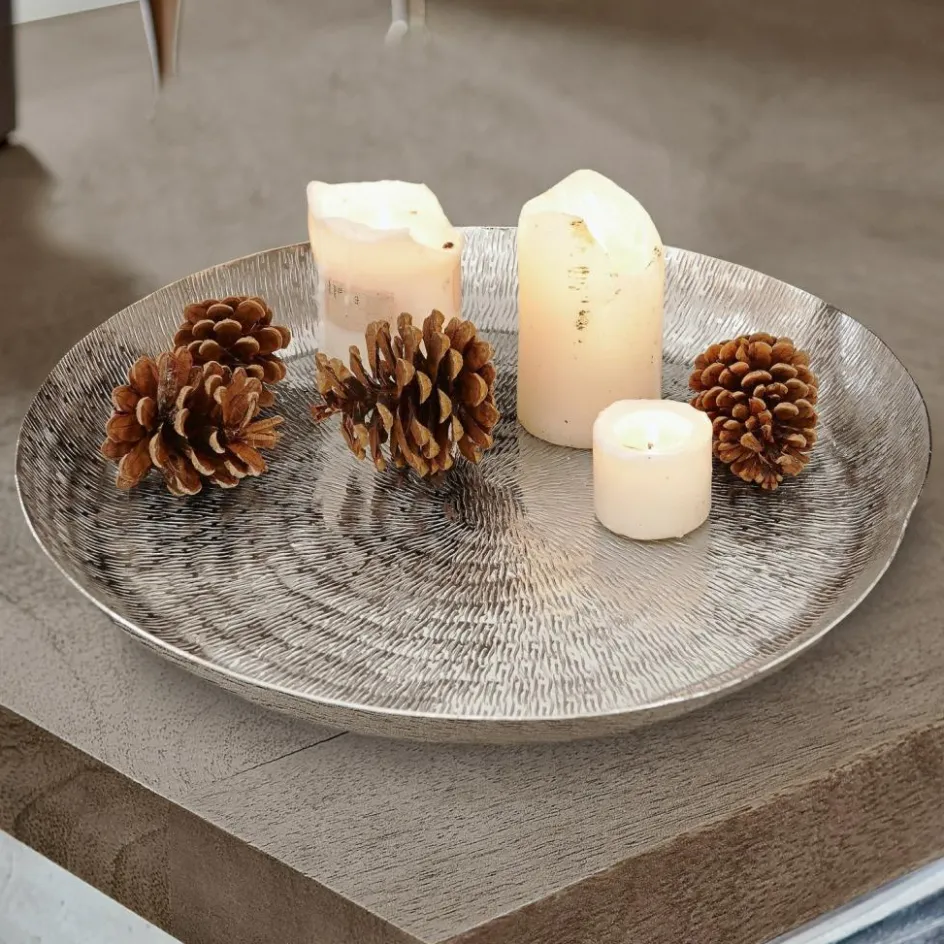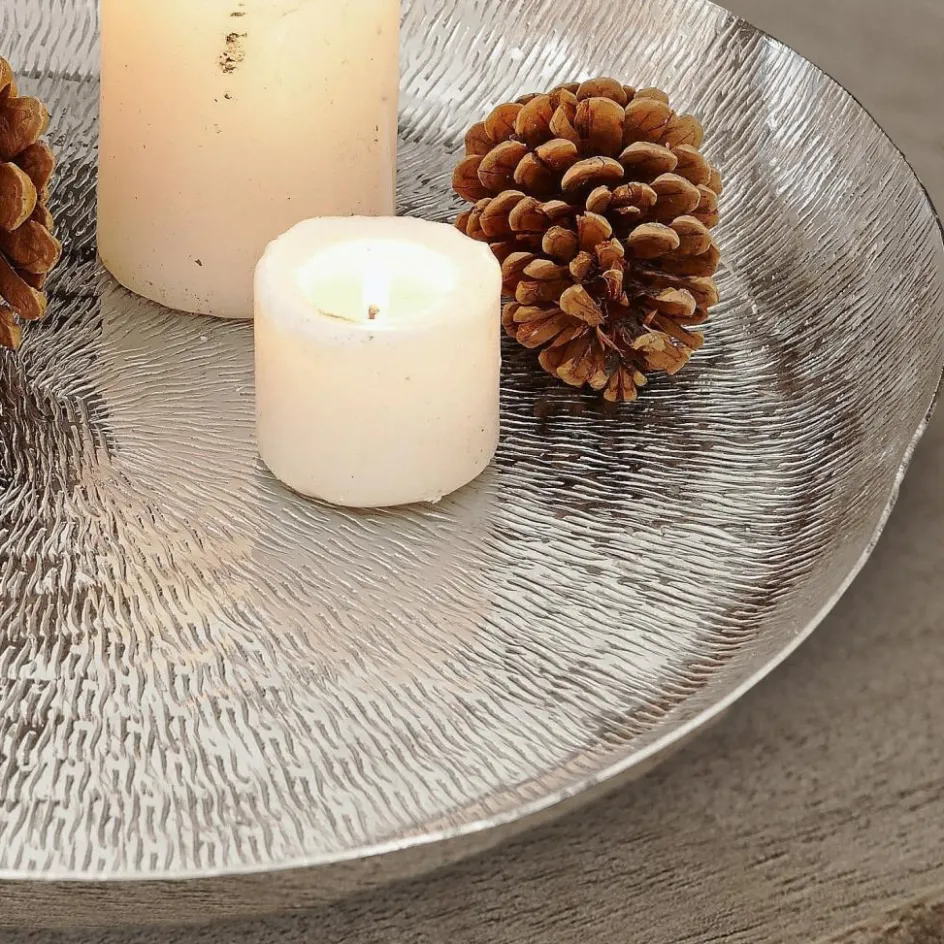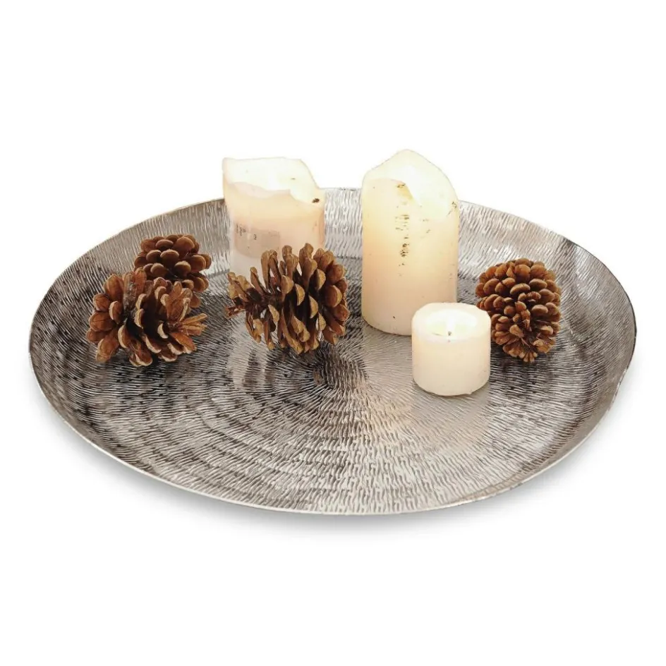 Dieses elegante, silberfarbene Tablett ist mit einem gehämmerten Muster in filigraner Reiskorn-Optik veredelt und zusätzlich mit einem liebevoll geformten, erhöhten Rand versehen. Ideal um darauf kleine Teelichtgläser aus Bauernsilber, Stumpenkerzen aber auch rustikale Arrangements aus Moos, Kiefernzapfen und einer Lichterkette zu dekorieren