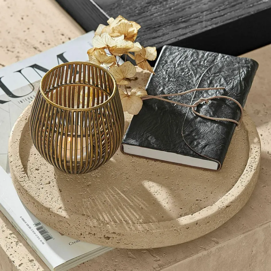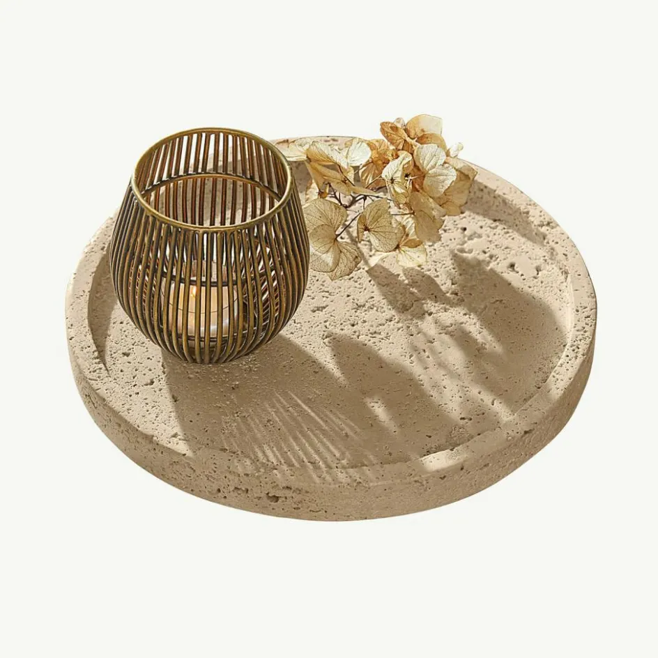 Mit diesem runden Tablett aus Travertin zieht ein Stück Natur in Ihr Zuhause ein. Die charakteristische Porenstruktur verleiht dem Stein eine lebendige Textur, während die sanften Sand- und Beigetöne eine harmonische Wärme ausstrahlen. Ob als stilvolle Ablage für Schmuck, Kerzen oder kleine Wohnaccessoires – dieses Tablett verbindet Funktionalität mit einer natürlichen Ästhetik. Der leicht erhöhte Rand sorgt für Sicherheit und eine schöne Rahmung der platzierten Gegenstände. Jedes Exemplar ist durch die individuelle Maserung des Travertins ein echtes Unikat und bereichert Ihr Interieur mit einem Hauch von zeitloser Schönheit.