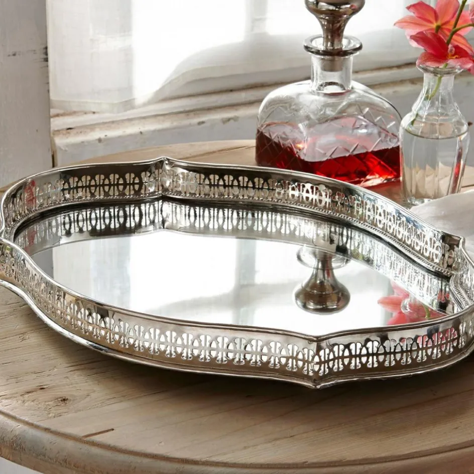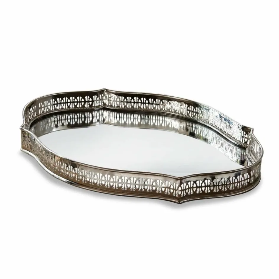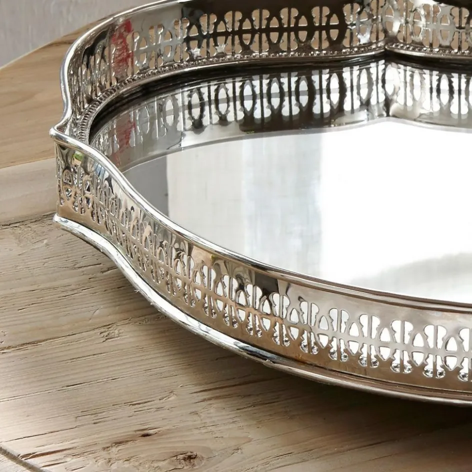 Geradezu atemberaubend anders präsentiert sich dieses glänzend vernickelte Messingtablett. Im Boden ist ein Spiegel eingelassen, der für eine faszinierende Optik sorgt, wenn man zum Beispiel ein paar hübsche Gefäße darauf abstellt. Der kunstvoll geformte Rand ist mit gestanzten Mustern geschmückt und unterstreicht den edlen Charakter des Tabletts. Stilvoller kann man Getränke und Snacks definitiv nicht servieren.