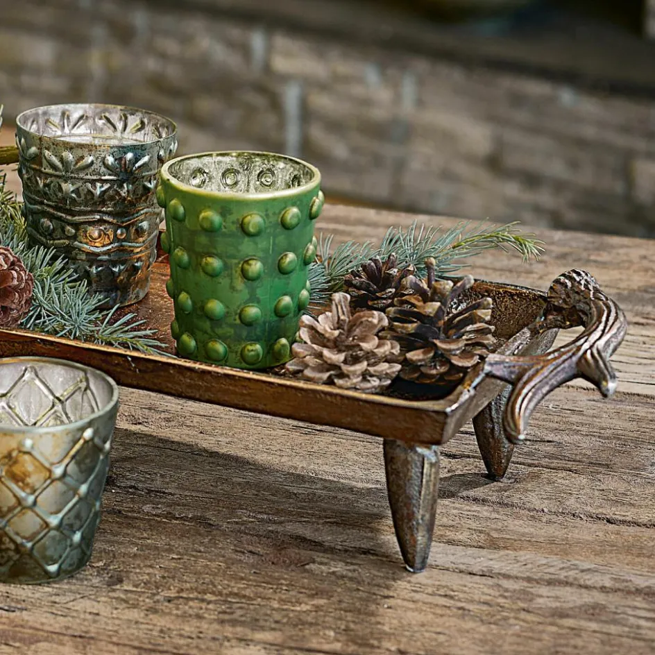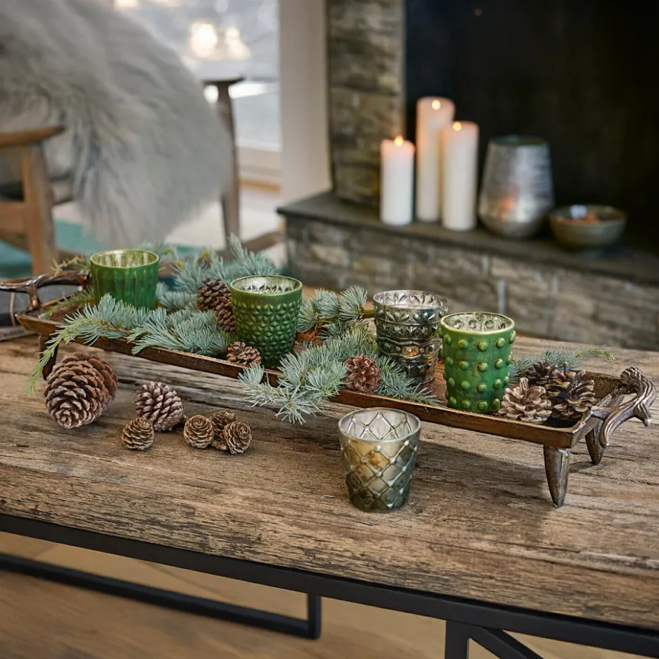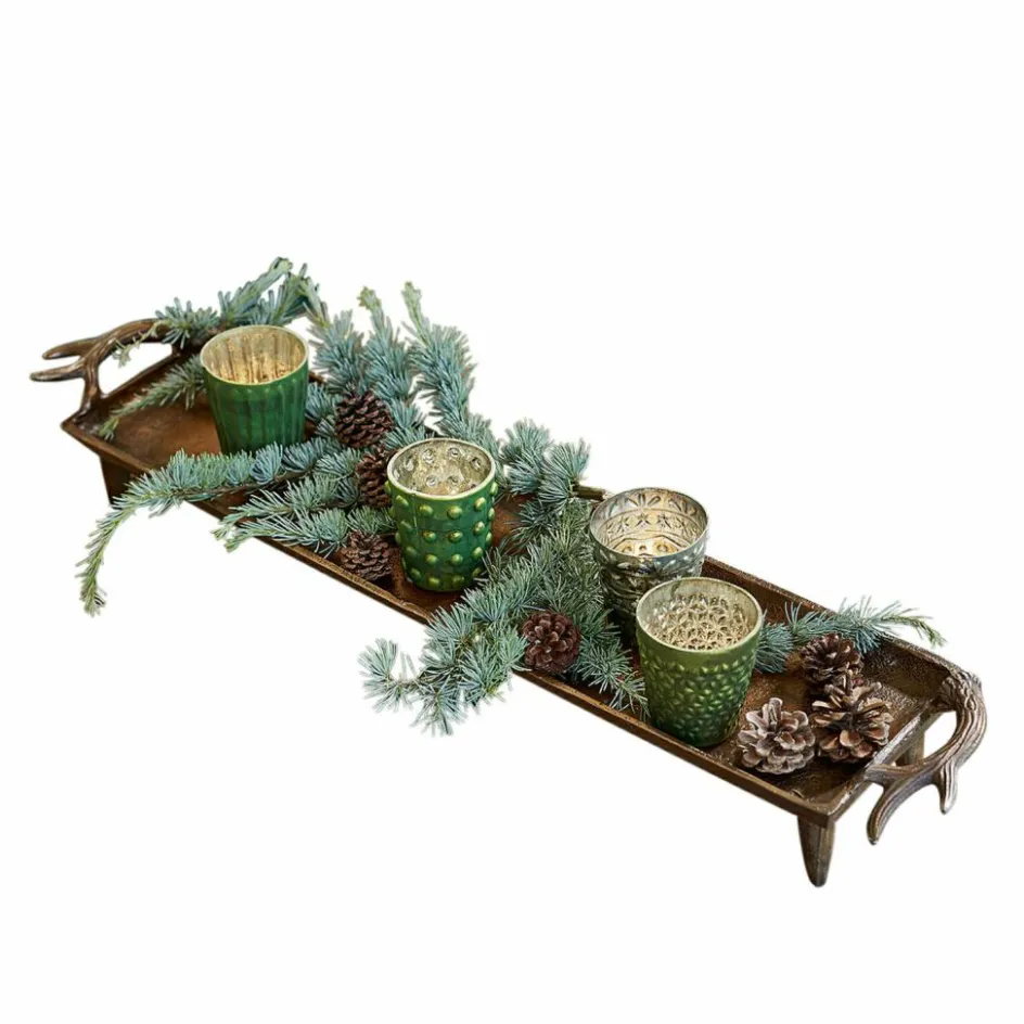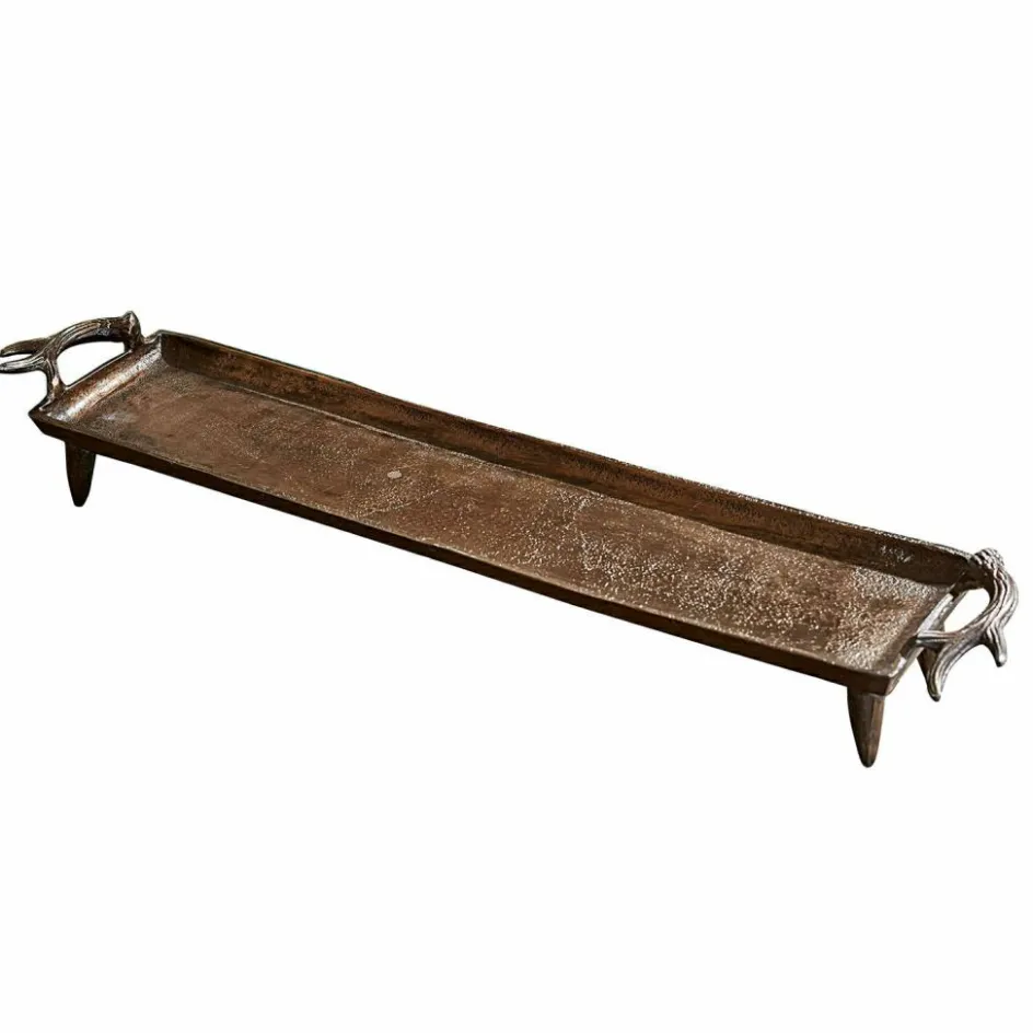 Eine außergewöhnliche Dekoration für Ihr Zuhause: Dieses Tablett aus Aluminiumguss mit Antikmessing-Finish ist ein faszinierender Blickfang. Die beiden Henkel in Form von Rentier-Geweihe sind einfach erstaunlich und verleihen ihm eine zauberhafte Note. Dank der wunderschönen Unebenheiten, die beim handgegossenen Aluminium entstehen, ist jedes Tablett ein echtes Unikat. Schaffen Sie mit diesem Schmuckstück ein schönes Ambiente und erfreuen Sie Ihre Gäste mit diesem beeindruckenden Accessoire.