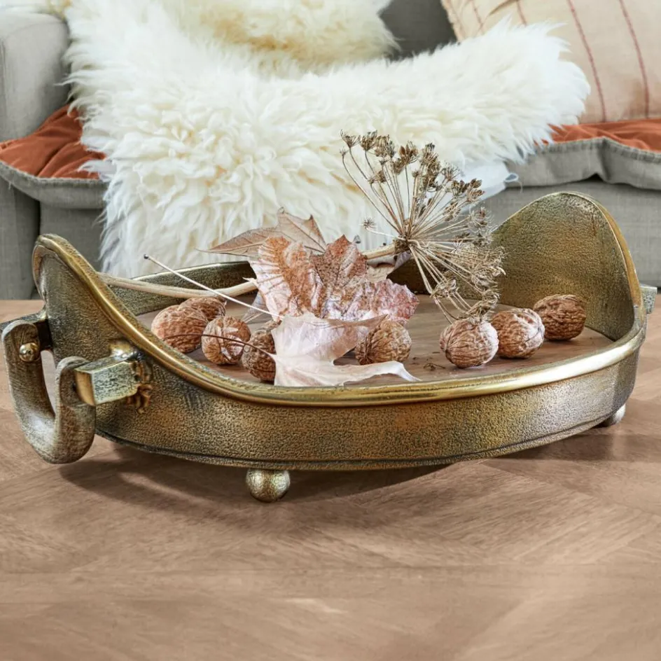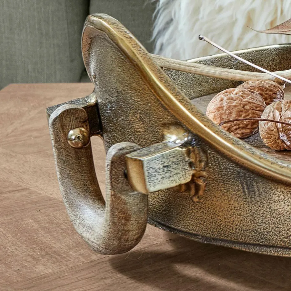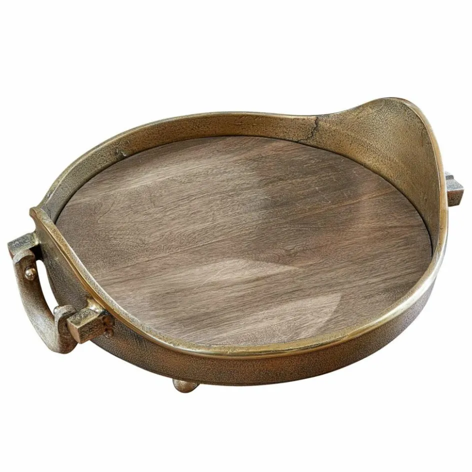 Ein sehr luxuriöses und elegantes Accessoire. Es besteht aus vernickeltem Aluminium und edlem Mangoholz im geschmackvollen Materialmix. Als Dekoration oder um den Tisch zu decken ist es einfach ideal. Stellen Sie sich ein gemütliches Wochenend-Frühstück vor: Arrangieren Sie frische Brötchen, duftenden heißen Kaffee, Orangensaft, Honig, feine Konfitüren und gekochte Eier darauf und freuen Sie sich auf diesen Schmaus. Vielleicht sogar himmlisch entspannt im Bett? Auch um den Tisch zum abendlichen Dinner bei gutem Wein und würzigen Köstlichkeiten zu decken ist das Luxus-Modell der perfekte Helfer. Dank der seitlichen Griffe ist es ganz leicht zu tragen. Doch auch als Basis für rein dekorative Arrangements eine wunderbare Wahl, etwa mit Kerzen, Windlichtern und frischen Blüten geschmückt. Wahrer Luxus für Detailverliebte.