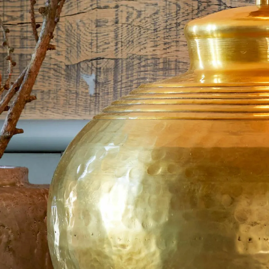 Manchmal genügt ein einziges Objekt, um einem Raum eine besondere Aura zu verleihen – diese Tischlampe ist genau solch ein Stück. Ihr bauchiger Lampenfuß mit sanft geschwungener Silhouette erzählt von traditioneller Handwerkskunst: In unzähligen Hammerschlägen ist eine lebendige Oberfläche entstanden, die das Licht sanft reflektiert. Der Schirm aus Baumwolle bildet dazu einen spannenden Kontrast und sorgt für ein angenehm gedämpftes Licht. Ein ausdrucksstarker Begleiter auf Sideboards, Beistelltischen oder im Schlafzimmer – immer dort, wo ein Hauch von Raffinesse gefragt ist.