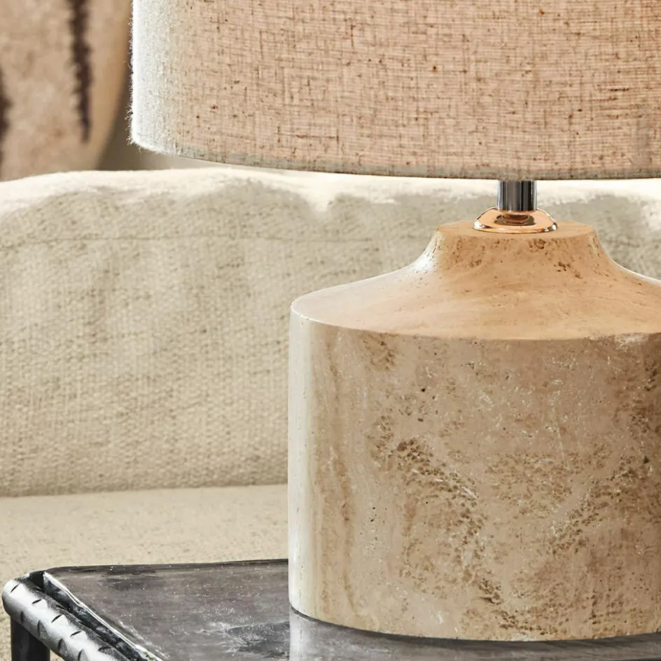 Ein Zusammenspiel aus Stein und Stoff, das Natürlichkeit und Eleganz ausstrahlt – diese Tischlampe ist mehr als eine Lichtquelle. Der Fuß aus Travertin beeindruckt mit seinen sanften Erdtönen und der einzigartigen Textur des Natursteins. Der helle Leinenschirm ergänzt das Design mit seiner feinen Struktur und sorgt für ein weiches, angenehmes Licht. Ob auf einem Sideboard, dem Nachttisch oder als Highlight im Wohnzimmer – diese Lampe bringt eine warme, wohnliche Atmosphäre in jeden Raum.