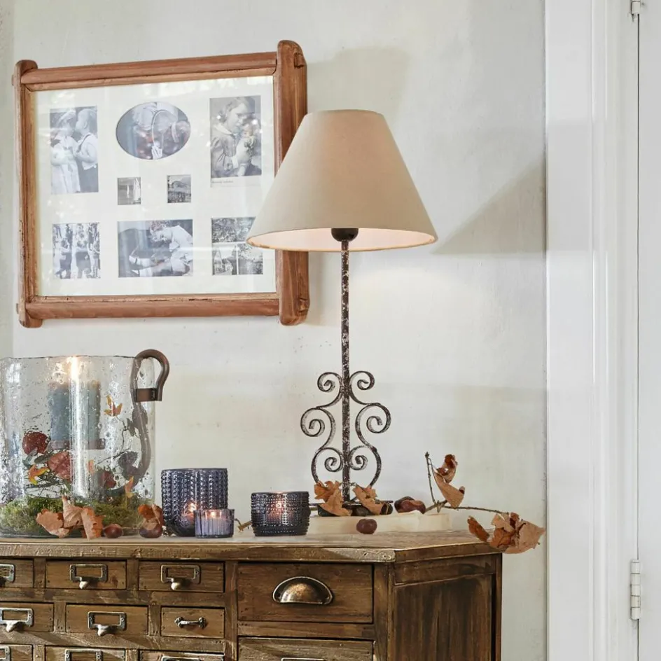 Der Lampenschirm in klassischer Form wurde aus einem Baumwoll-Polyester-Mix gefertigt und sorgt für ein angenehm warmes Licht. Der Lampenfuß wirkt beinahe filigran – der Ständer mit ornamentaler Verzierung wurde handbearbeitet und mit einem Vintage-Finish versehen. Die Kombination aus klassischem Design und Vintage-Finish setzt einen individuellen Akzent und wird zum wortwörtlichen Highlight Ihres Zuhauses.