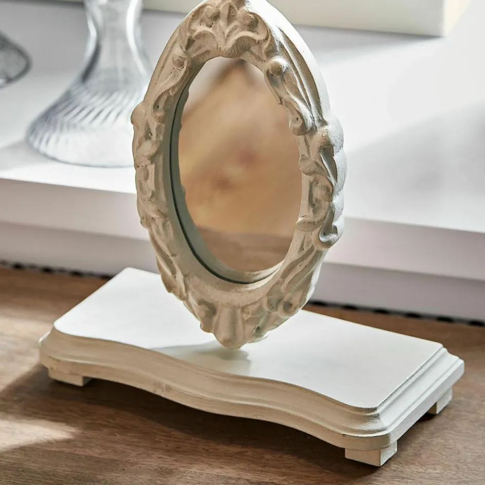 Es sind die kleinen Überraschungen, die ein Objekt besonders machen – und bei dieser Tischlampe ist es zweifellos der integrierte Spiegel, eingerahmt von einem verspielten Ornament aus cremefarbenem Holz. Der gedrechselte Fuß auf geschwungener Basis wirkt wie ein Fundstück aus einem französischen Landhaus. Der Schirm aus plissiertem Stoff vollendet das Design mit einer sanften Lichtwirkung, die Räume in warmes, zurückhaltendes Licht taucht. Ob als stilvoller Akzent auf dem Nachttisch oder als charmantes Highlight auf einer Konsole – diese Lampe schenkt nicht nur Licht, sondern auch Charakter.