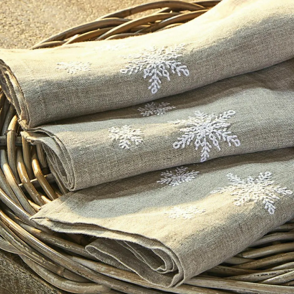 Winterzauber stilvoll auf den Tisch gebracht. Diese Stoffservietten verleihen Ihrer festlich gedeckten Weihnachtstafel eine Extraportion Eleganz und Gemütlichkeit. Mit ihrer filigranen Schneeflocken-Stickerei sind sie auch ein hübscher Blickfang. Das hochwertige Leinengewebe besitzt eine bakterienhemmende Oberfläche, ist strapazierfähig und langlebig. Eine ideale Qualität für diese noblen Tischaccessoires, die eine wunderbare Alternative zu Papierservietten sind – auch im nachhaltigen Sinne. Nach Gebrauch können diese Stoffservietten schließelich einfach in der Maschine gewaschen werden. Mit rustikalem Steingut-Geschirr harmoniert das Servietten-Set genauso schön wie mit feinem Porzellan.