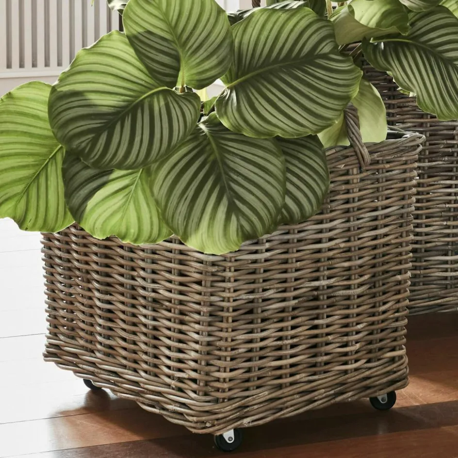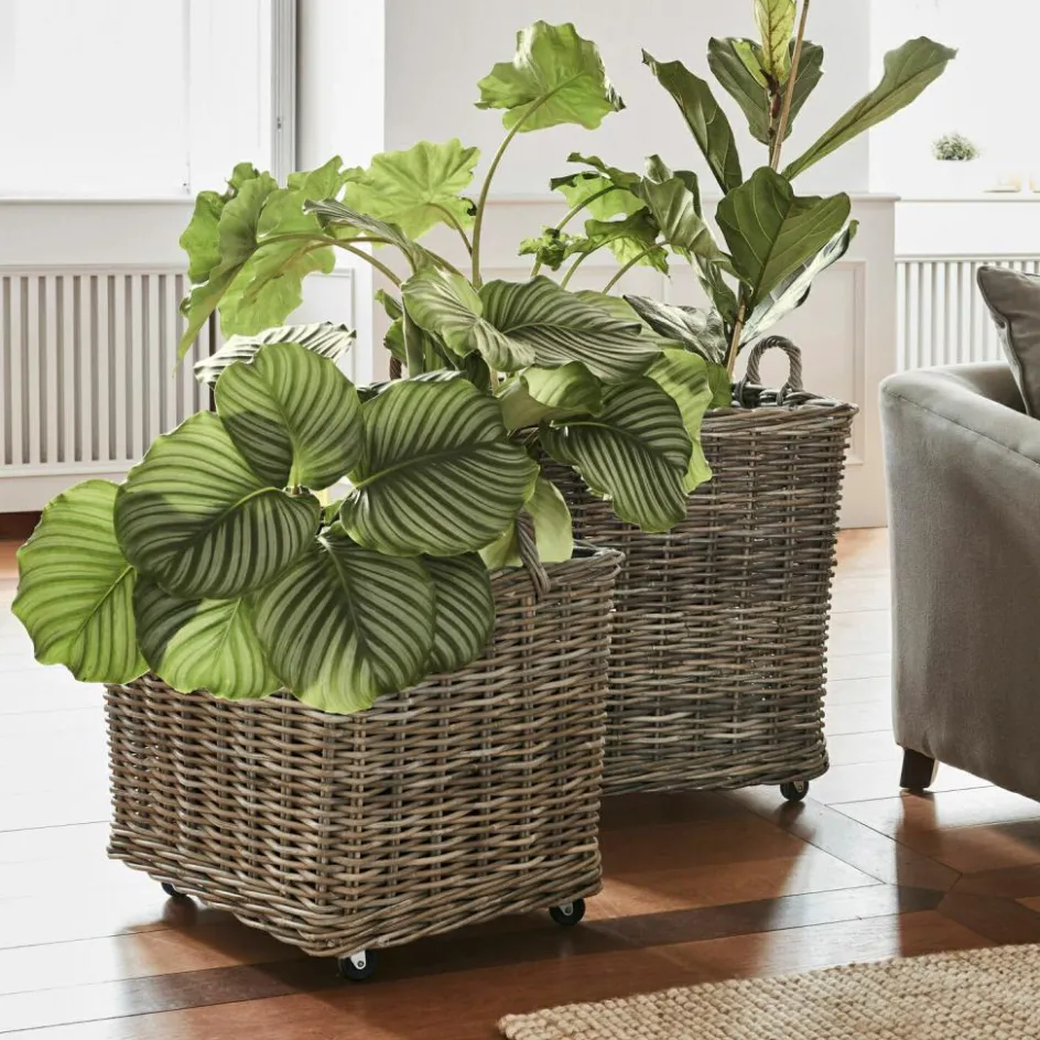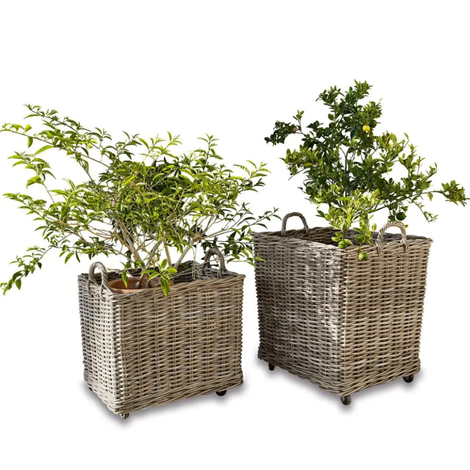 Freuen Sie sich auf ein ansprechendes Duo aus rein natürlichen und edlen Materialien. Die beiden großen Körbe sind aufwendig aus Rattan geflochten, und unten befindet sich eine wertvolle Platte aus Teakholz. Dank angebrachter Rollen sind sie ganz leicht und flexibel verstellbar. Sie erhalten zwei Größen im Set. Die attraktiven und klassischen Designs veredeln überdachte Außenbereiche und natürlich Innenräume. In ihnen lassen sich Decken, Kissen und mehr verstauen oder mit Trockenpflanzen verschönern. Eine direkte Bepflanzung sollten Sie nur mit einer Folie oder einem wasserfesten Übertopf vornehmen, um das Rattan vor Staunässe zu schützen. Das stilsichere Design harmoniert mit jedem Ambiente und lässt sich gut kombinieren.