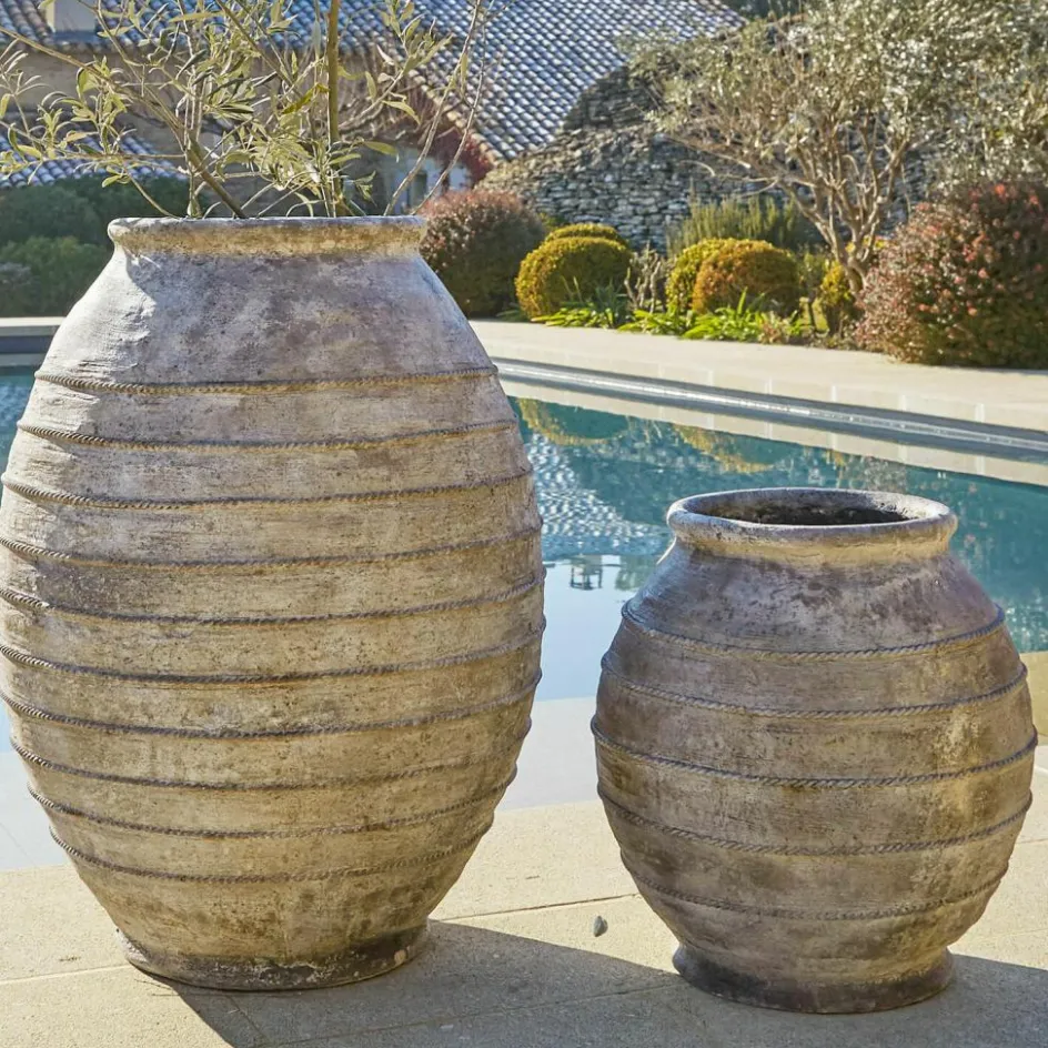 Diese hochwertigen Übertöpfe sind aus massivem Zement gefertigt und präsentieren eine charmante Rillen-Opik, die nicht gerade alltäglich ist. Der große Übertopf ist perfekt, um sommerliche Arrangements mit frisch duftenden Wildrosen oder Hortensien zu kreieren, während das kleine Modell die selbst gepflückten Blumen aus dem eigenen Garten perfekt zur Geltung bringt. Die robuste Konstruktion und die raffiniert strukturierte Oberfläche machen sie perfekt für jede Umgebung – von der Küche, bis zum Wintergarten! Die Übertöpfe eignen sich auch hervorragend als Einzeldekoration, beispielsweise in Kombination mit getrockneten Sträuchern oder einem LED-Leuchtmittel zur indirekten Beleuchtung der Umgebung. Das aufwendig applizierte Antik-Finish rundet die zwei großen Modelle im Antik-Design zusätzlich ab.