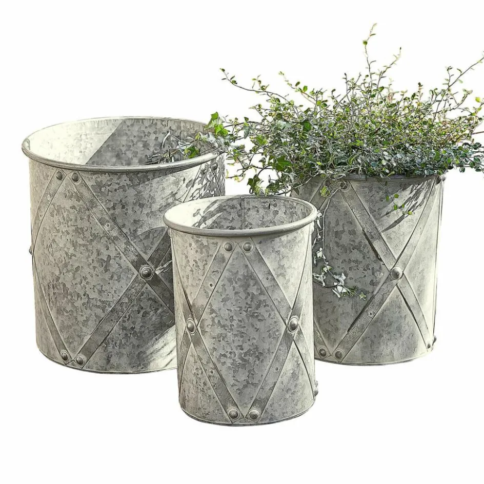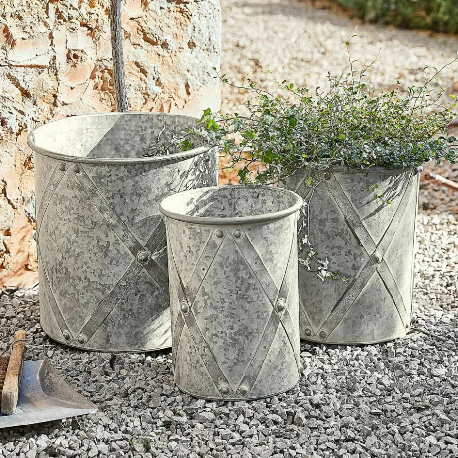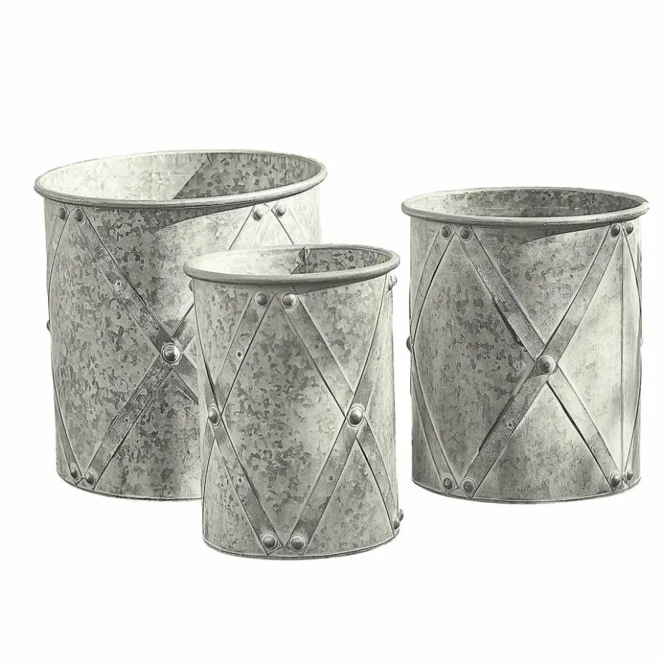Dieses Übertopf-Set verleiht Ihrem Garten oder Innenbereich eine Prise rustikalen Charme. Die drei verschiedenen Größen erlauben es Ihnen, ein harmonisches Ensemble aus grünen Schönheiten zu schaffen oder die Töpfe einzeln zu inszenieren. Jedes Stück ist mit einem feinen Antik-Finish versehen, das für einen authentischen Vintage-Look sorgt und an vergangene Zeiten erinnert. Die kunstvoll gesetzten Nieten und das klassische Rautenmuster verleihen den Töpfen Charakter und sorgen für eine optische Tiefe. Mit den praktischen Wasserablauflöchern bieten sie zudem ideale Bedingungen für gesunde Pflanzen – ein stilvolles Zuhause für Ihre grünen Lieblinge.