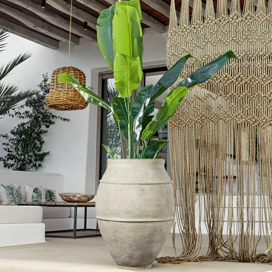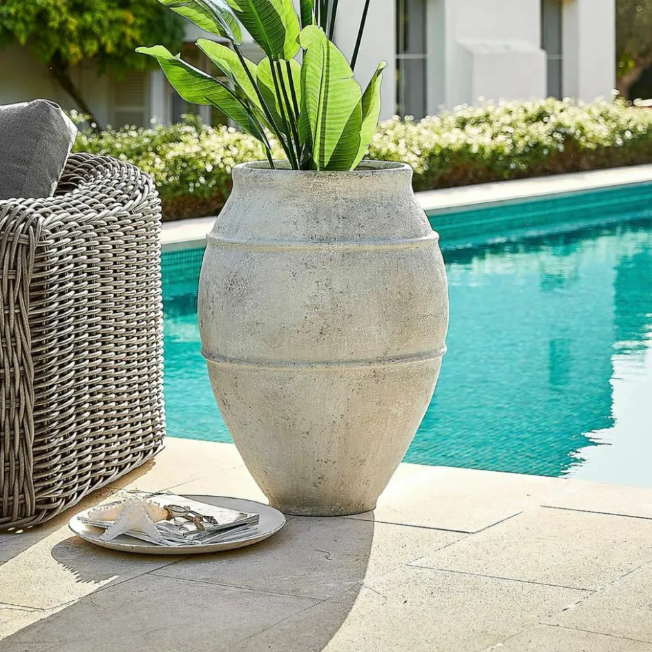 Was fasziniert uns eigentlich so an antiken Gefäßen? Die Vorstellung, dass sie auf eine aufregend lange Lebenspanne zurückblicken können und uns einen Blick in die Vergangenheit erlauben, als robuste Gefäße aus Terrakotta eine feste Rolle im antiken Alltag spielten? Auch dieser Übertopf lässt uns mit seiner imposanten Größe und der klassischen Form das Flair vergangener Epochen spüren. Aber auch wenn die verwitterte Oberfläche eine andere Geschichte erzählt, ist der Übertopf doch ein Produkt des 21. Jahrhunderts. Er wurde nicht aus Terrakotta, sondern aus modernem Polyresin gefertigt, einem Kunststein, der mit einer ausgezeichneten Bruchfestigkeit und Witterungsfestigkeit traditioneller Keramik weit überlegen ist. Ob mit oder ohne Pflanze – der Übertopf wird Ihren Outdoor-Bereich an vielen Stellen mit mediterranem Flair bereichern. Im Winter sollte der Übertopf frostsicher gelagert werden.