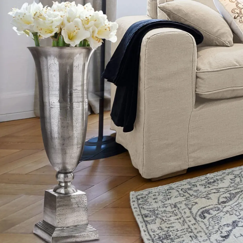 Die imposante Bodenvase in klassischer Pokalform wurde in Handarbeit mit einem Finish in Antiksilber versehen und matt gebürstet. So ist das außergewöhnliche Objekt nicht nur besonders unempfindlich in der Handhabung und Pflege, sondern auch ein ganz besonders schöner Anblick. Ob ganz pur oder gefüllt mit blühenden Ästen oder langstieligen Lilien – diese Bodenvase verleiht jedem Raum im Handumdrehen das gewisse Etwas. Unser Tipp: Großzügige Wohnräume oder auch der Eingangsbereich werden von dieser Vase – besonders auch im Doppelpack – absolut stilvoll dekoriert und geradezu geadelt.