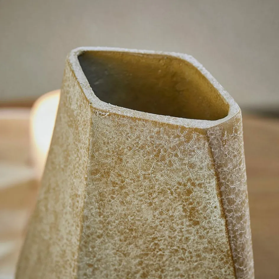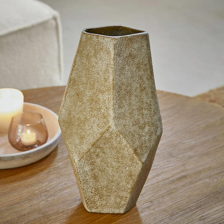 Mit ihrer ausdrucksstarken, skulpturalen Form zieht diese Deko-Vase aus Aluminium mühelos alle Blicke auf sich. Sanft schimmernde Facetten, die wie von Hand modelliert wirken, verleihen ihr einen charaktervollen und zugleich zeitlos schönen Look. Die fein strukturierte Oberfläche fängt das Licht auf subtile Weise ein und setzt je nach Blickwinkel unterschiedliche Akzente. Ob mit zarten Trockenblumen bestückt oder pur arrangiert – dieses kunstvolle Objekt lässt jeden Raum leuchten und bringt moderne Wohnträume in eine harmonische Balance zwischen Natürlichkeit und Design.