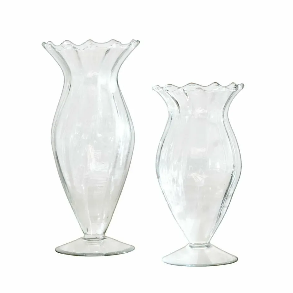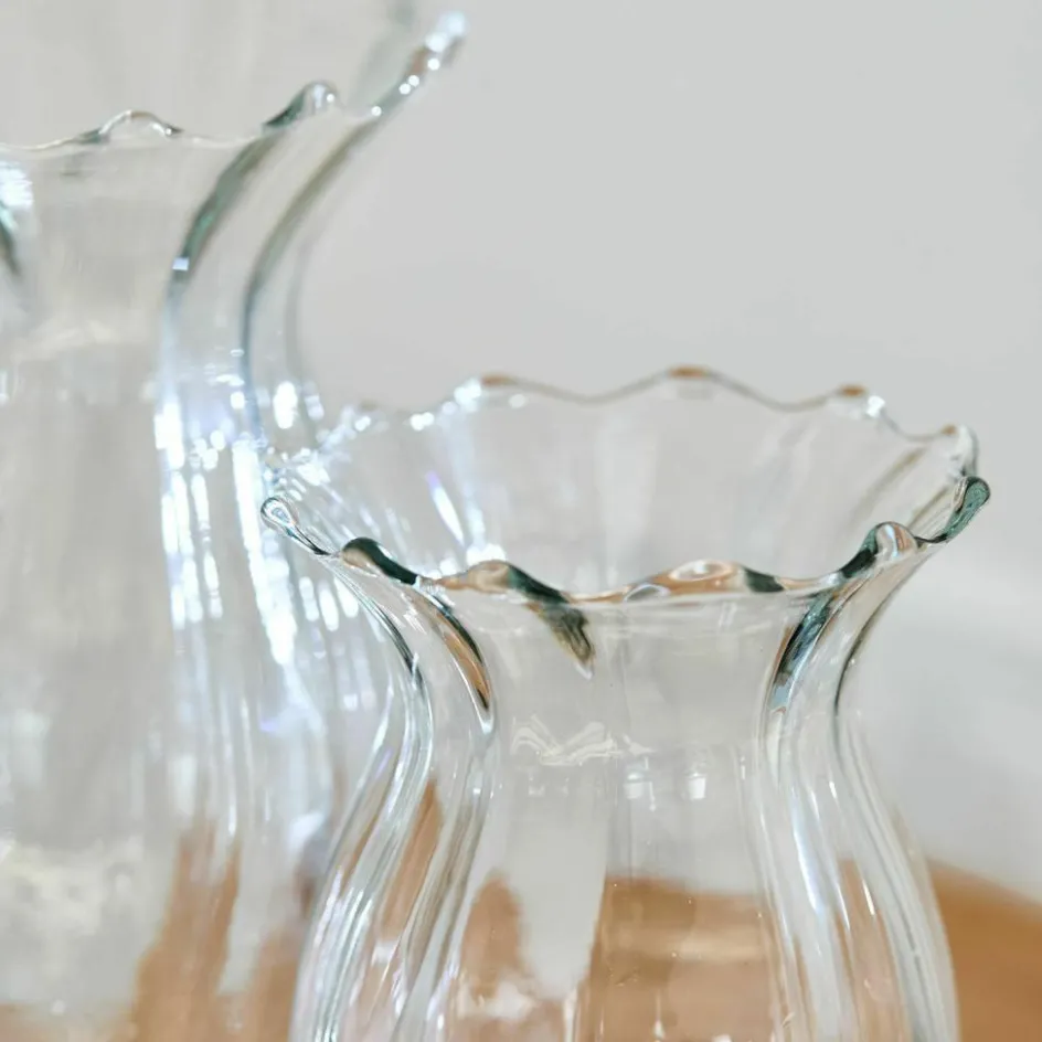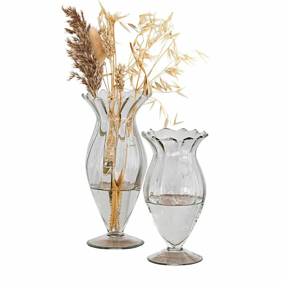 Harmonie und Anmut treffen in diesem 2er-Set aufeinander. Die Vasen begeistern durch ihre geschwungene Tulpenform, die eine natürliche Eleganz und Leichtigkeit ausstrahlt. Das klare Glas lässt den Inhalt im Mittelpunkt stehen und bringt die Farben Ihrer Blumen oder Dekoelemente wunderschön zur Geltung. Die leicht gewellte Öffnung ergänzt das formschöne Design und sorgt für einen charmanten Blickfang. Ob als Duo oder einzeln dekoriert – diese Vasen setzen überall einen geschmackvollen Akzent und bereichern Ihr Zuhause mit ihrer zeitlosen Ästhetik.