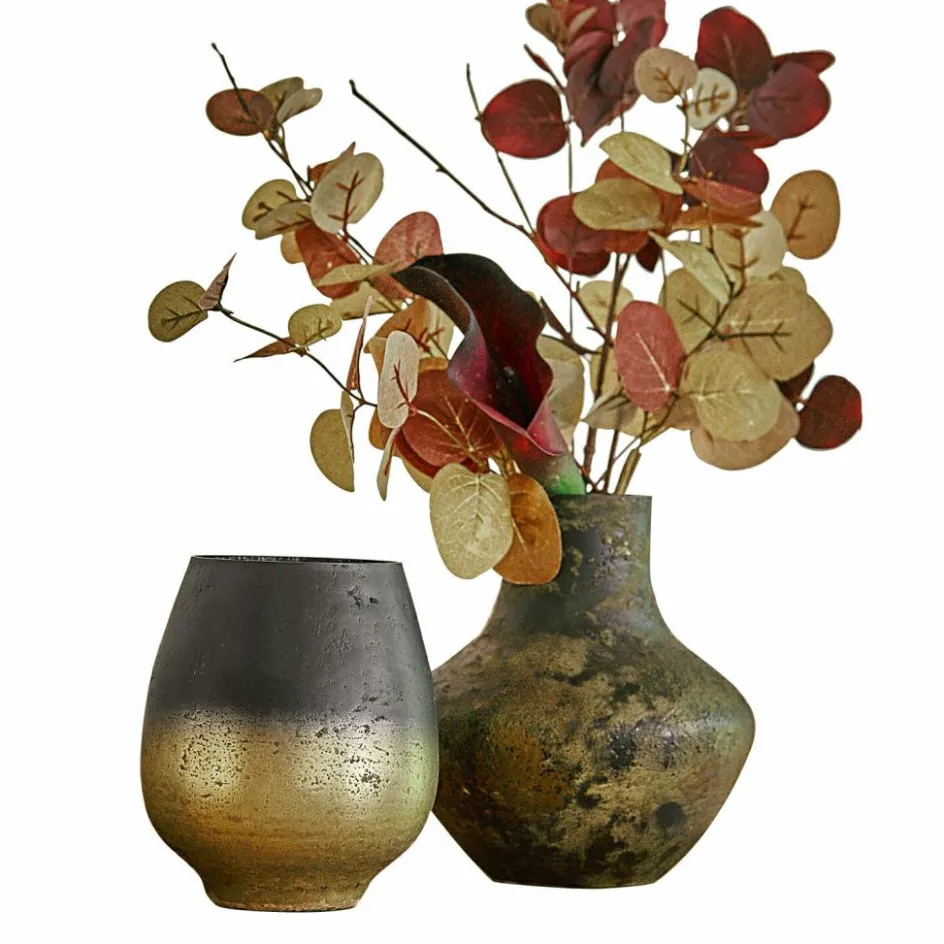 Manchmal zeigen auch Wohnaccessoires ganz besondere Reize. Damit überrascht auch dieses Vasen-Set aus Glas, das in traditioneller Handwerkskunst mundgeblasen ist. Beide Vasen machen allein schon durch ihre unterschiedlichen Formgebungen eine gute Figur. Ihren außergewöhnlichen Charakter erhalten sie jedoch durch das rustikal anmutende Oberflächen-Finish, das mit matten, goldfarbenen Effekten akzentuiert ist. Eine spannende Gestaltungsidee, die jedes Stück zu einem stilvollen Hingucker und unvergleichlichen Unikat macht. Das Duo harmoniert mit jedem Einrichtungsstil und setzt frische Blumen genauso schön in Szene wie einzelne Kunstblüten oder Zweige. Ganz ohne Dekor sind sie auch im Regal ein Augenschmaus.