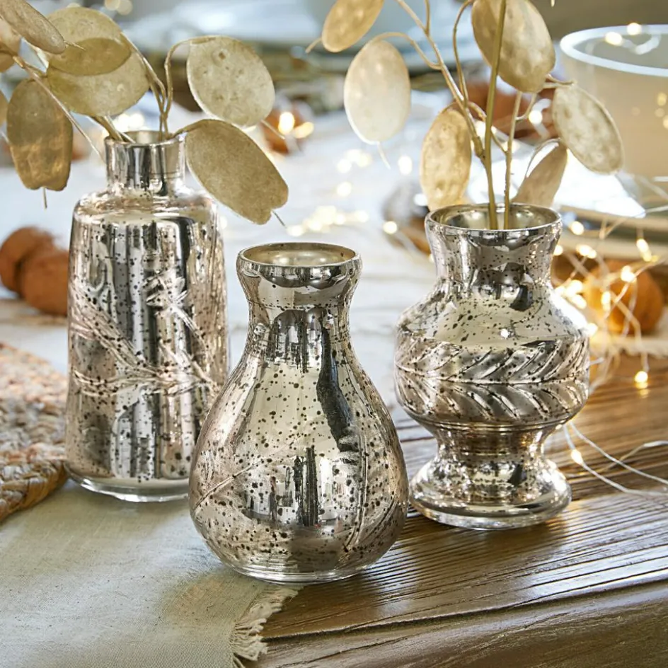 Dieses bezaubernde Vase 3er Set verleiht jedem Raum einen Hauch von Nostalgie und Eleganz. Jede Vase ist aus mundgeblasenem Glas gefertigt und mit kunstvollen, blumenartigen Schliffen verziert, die in Kombination mit dem edlen Bauernsilber-Finish ein wahrhaft zauberhaftes Erscheinungsbild schaffen. Diese Vasen sind ideal für Trockengestecke und setzen Ihre floralen Arrangements perfekt in Szene. Die unterschiedlichen Formen und Größen der Vasen sorgen für ein harmonisches Gesamtbild, das in jeder Ecke Ihres Zuhauses für einen stilvollen Blickfang sorgt.