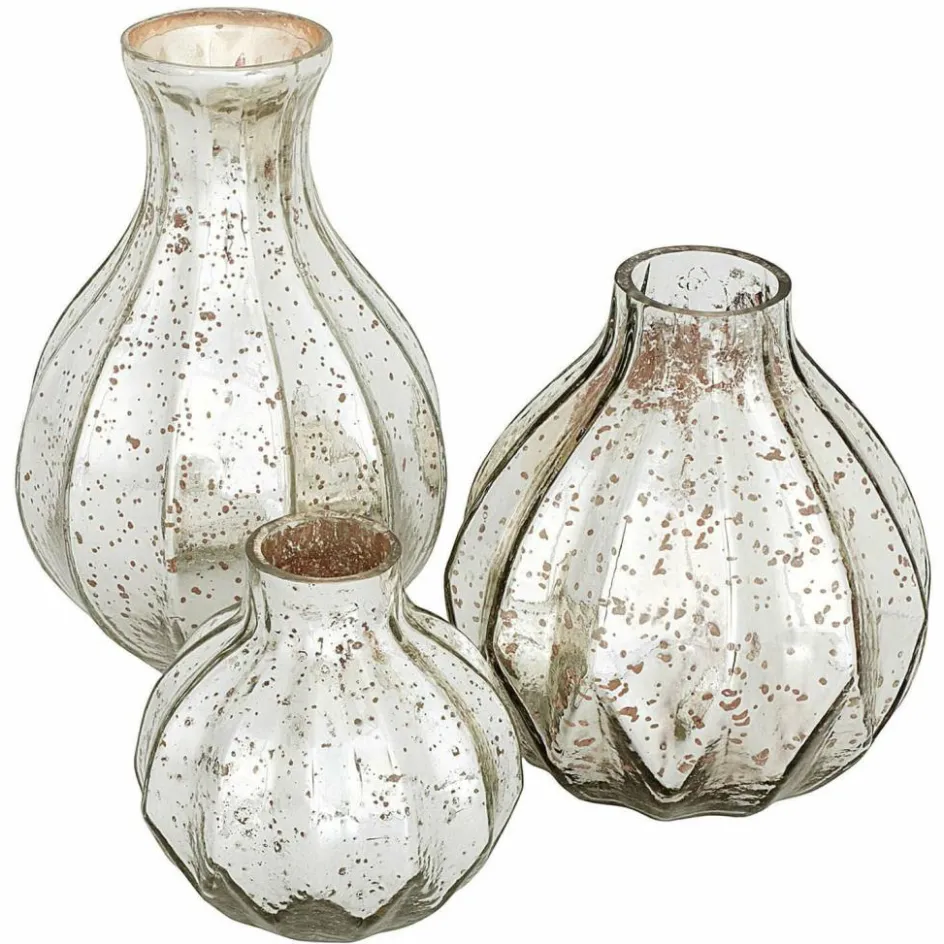 Die traditionelle Technik des Bauernsilbers ist auch in modernen Zeiten im Trend. Auch dieses Vasen-Set macht sich diese Idee zu eigen und sorgt für ganz viel Wirkung. Hier wird Glas von innen verspiegelt und – für den reizvollen Vintage-Charme – zusätzlich mit einer antiken Patina versehen. Der edle Silberglanz verleiht den Accessoires eine elegante Noblesse, die alle Blicke auf sich zieht. Jede Vase setzt sich in Form und Größe ganz individuell in Szene. Zusammen sorgen sie für ein stimmungsvolles Gesamtbild. Mit Zweigen, frischen oder künstlichen Blumen können Sie wunderschöne Stillleben auf Ihrem Sideboard arrangieren. Auch auf Ihrer Gästetafel setzen die Glasvasen hübsche Akzente – und vertragen sich mit elegantem Porzellan ebenso gut wie mit rustikalem Steingut-Geschirr.