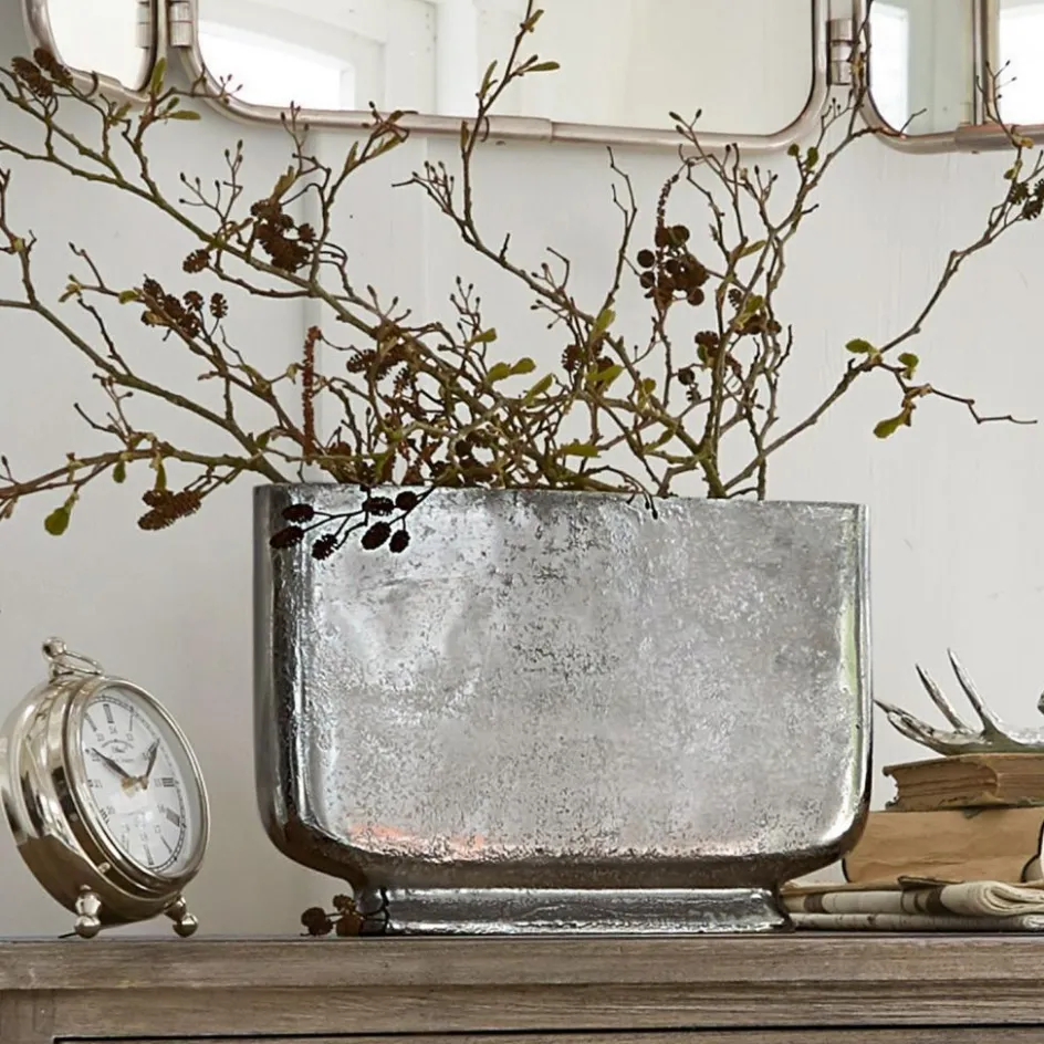 Eine Vase, die mit wenig Dekoration auskommt und durch die moderne, klare Form auch solo wie ein wertvolles Kunstobjekt wirkt! Mit nur 5 cm Tiefe ideal für Kommoden oder fürs Fensterbrett. Aus schwerem Aluminiumguss mit Antik-Finish.