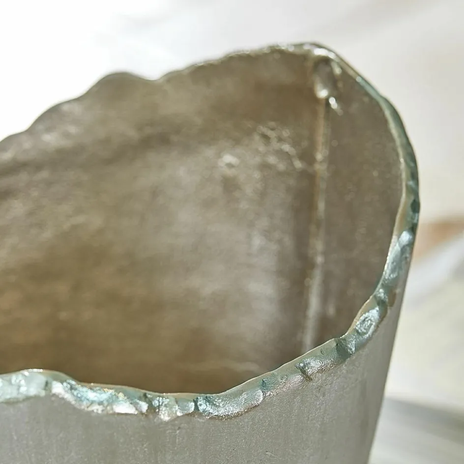 Diese außergewöhnliche Vase aus Aluguss besticht durch ihre harmonische Verbindung von roher Materialität und kunstvoller Gestaltung. Die matte Außenseite verleiht ihr eine sanfte, beruhigende Präsenz, während die glänzende Innenseite das Licht auf faszinierende Weise reflektiert. Die unregelmäßigen Kanten unterstreichen den individuellen Charakter dieser Vase, die sich besonders gut für Trockengestecke eignet. Jede Vase ist durch ihre Form ein ganz besonderes Unikat. Ein wahres Schmuckstück, das sowohl in modernen als auch in klassischen Einrichtungsstilen Akzente setzt und Ihren Räumen eine besondere Ausstrahlung verleiht.