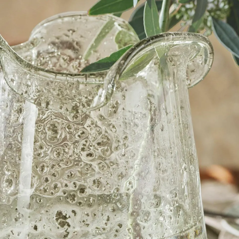 Diese mundgeblasene Vase ist ein wahres Meisterwerk der Glaskunst und besticht durch ihre charmant unregelmäßige Form. Die kleinen Partikel im Glas verleihen ihr eine faszinierende Struktur und ein rustikales Flair, das perfekt zu naturverbundenen Einrichtungsstilen passt. Jeder einzelne Einschluss und die individuellen, handgefertigten Details machen diese Vase zu einem absoluten Unikat, das sowohl alleinstehend als auch mit Blumenarrangements Aufmerksamkeit auf sich zieht. Ihre leicht organische Form und die subtil schimmernden Partikel fangen das Licht auf einzigartige Weise ein und schaffen so eine warme, einladende Atmosphäre. Diese Vase bringt Authentizität und Charme in Ihr Zuhause und erzählt die Geschichte traditioneller Handwerkskunst, die jeden Raum mit einem Hauch von Nostalgie und natürlicher Schönheit erfüllt.