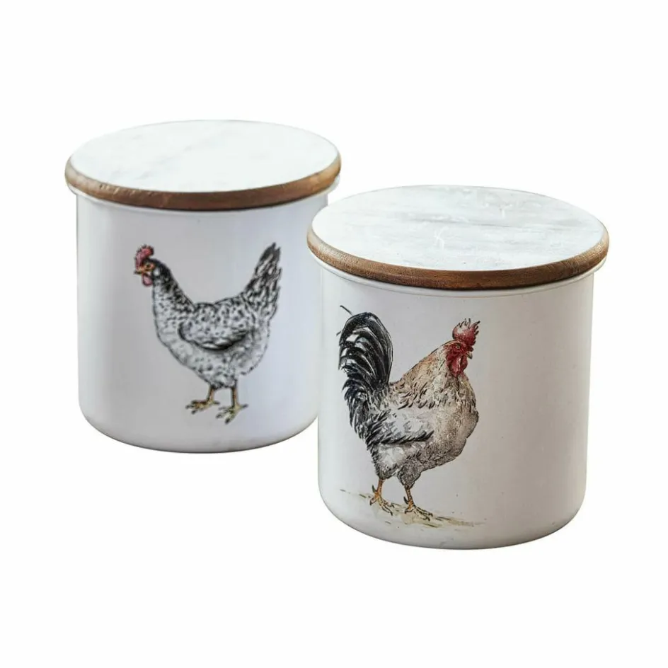 Diese beiden charmanten Dosen sind kunstvoll mit hübschen Motiven von Huhn und Hahn verziert und erinnern an eine gemütliche Farm auf dem Land. Sie bestehen aus Eisen und einem hübschen Kiefernholz-Deckel. Durch die sehr gute Gummiabdichtung sind sie bestens zur Aufbewahrung geeignet – vielleicht für eingepackte Süßigkeiten, Teebeutel oder auch Zucker. In der Küche zaubert das Duo so auch gleich Landhaus-Flair herbei, doch auch Haarschmuck und Schmuckstücke, Münzen, Schlüssel und andere kleine Accessoires lassen sich darin dekorativ verwahren. Hier sind Nutzen und Dekoration ideal vereint.