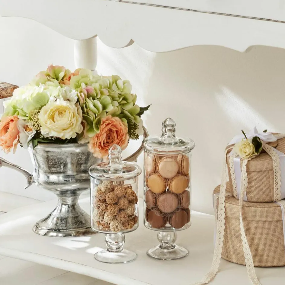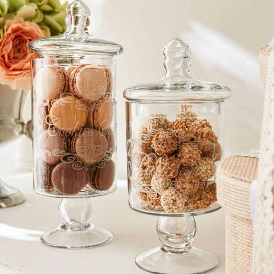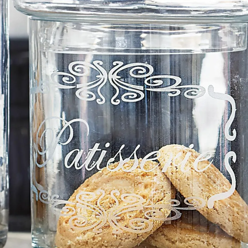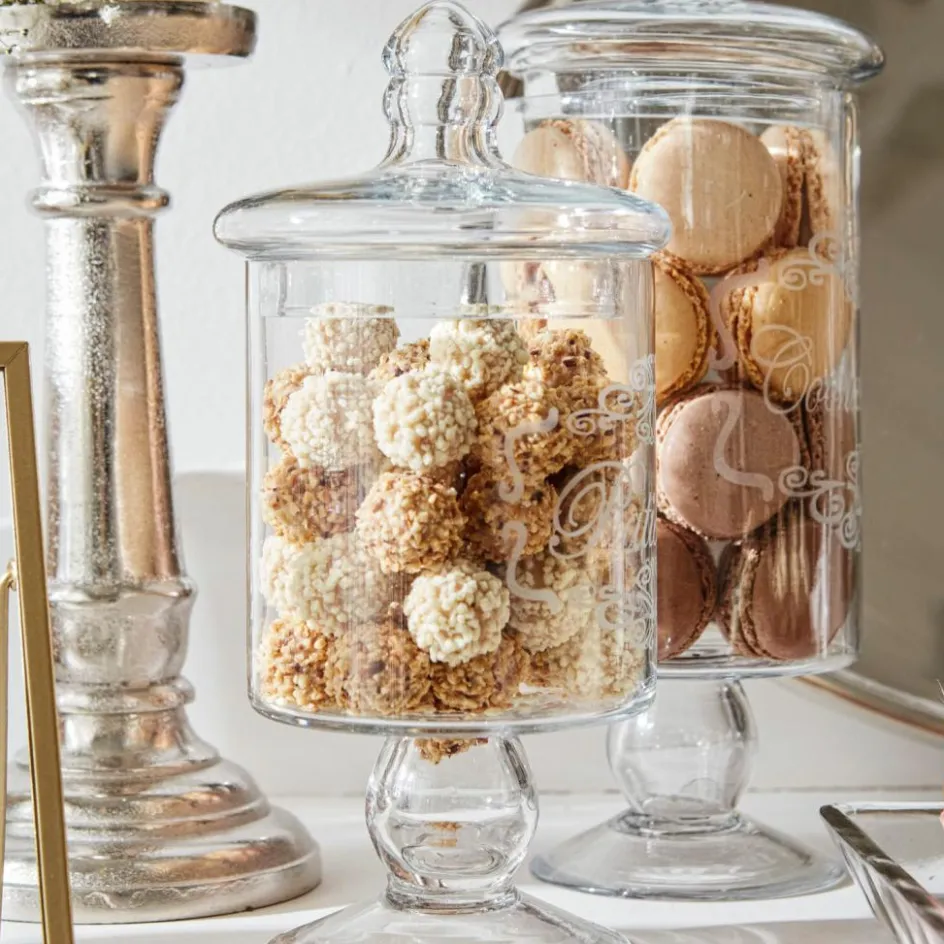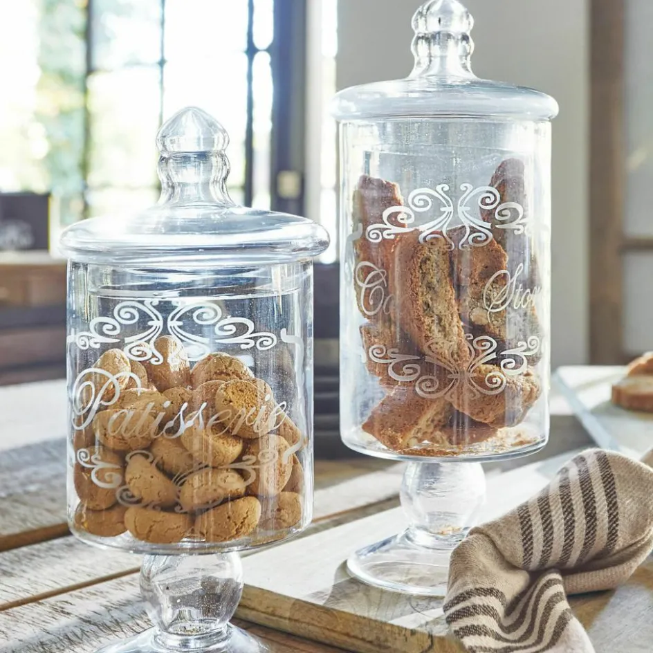 Klares Glas, fein geschwungene Formen und filigrane Gravuren mit einer Extraportion Charme – dieses wunderhübsche Duo lässt das Herz aller Naschkatzen und Romantiker höherschlagen. Die schönen Gläser in zwei Größen sind mit fein gestalteten Aufschriften wie „Patisserie“ und „Cookies Store“ verziert – einfach köstlich! Unter den dekorativen gläsernen Deckeln wird alles hygienisch und ansehnlich verwahrt. Beide Modelle stehen auf einem schlanken Fuß. Einfach das perfekte Plätzchen für süße Leckereien wie Kekse, Schokolade, Gebäck, Zucker oder Tee. Ein nostalgisch inspiriertes Traum-Accessoire.