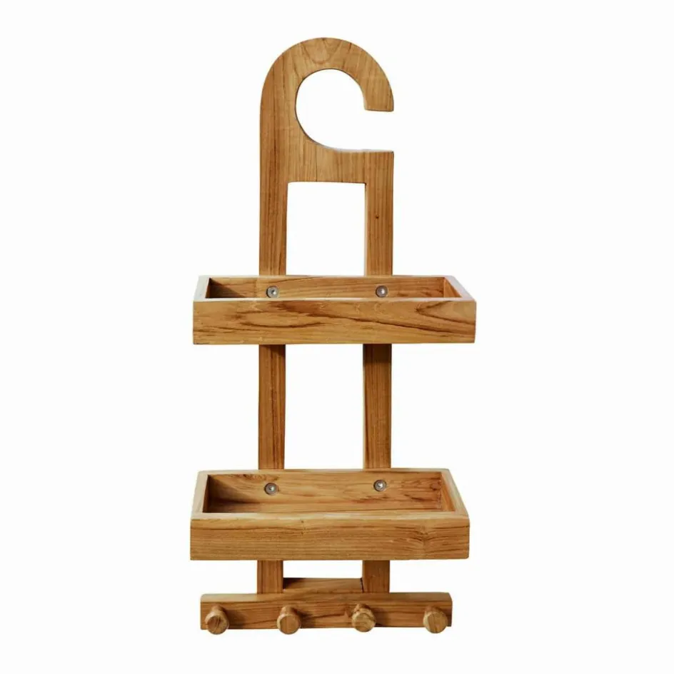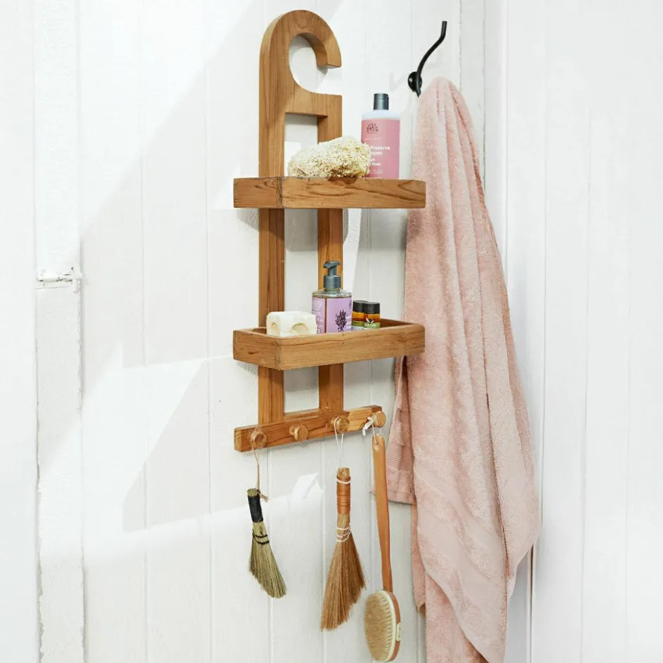 Dieses Duschregal überzeugt mit einem raffinierten Design, das optisch an klassische Hängevarianten erinnert, aber für die feste Wandmontage gedacht ist. Gefertigt aus wiederaufbereitetem Teakholz, bringt es eine warme, natürliche Note ins Badezimmer. Die zwei Ablageflächen bieten Platz für Pflegeprodukte, während die unteren Haken zusätzlichen Stauraum für Bürsten oder Schwämme schaffen. Eine charmante Kombination aus Funktionalität und Ästhetik.