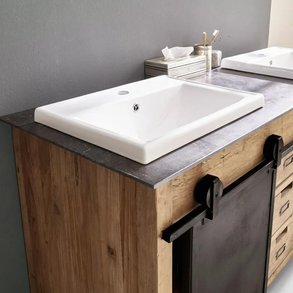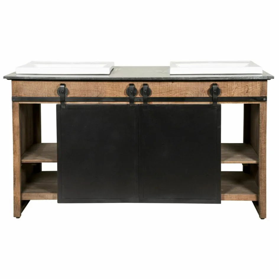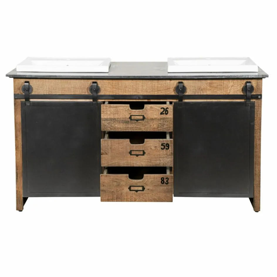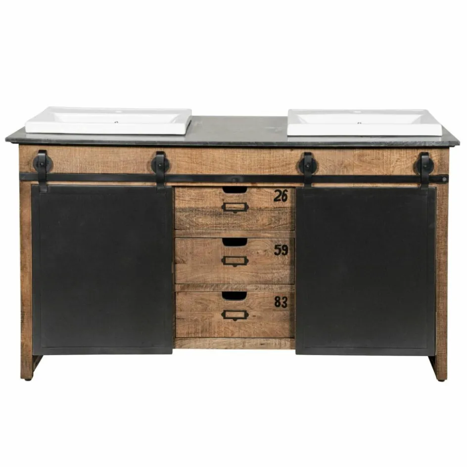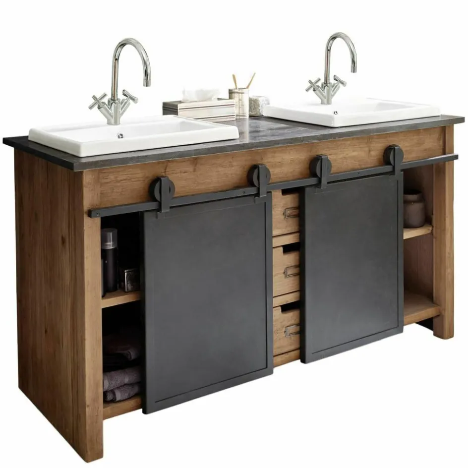 Dieser prächtige Doppelwaschtisch begeistert durch ein funktionelles Vintage-Design, das viel Stauraum bietet und eine stilvolle Bereicherung für jedes Badezimmer darstellt. Das prächtig gemaserte Mangoholz kontrastiert perfekt mit der edlen Marmorplatte und den zeitlos schönen Keramik-Becken. Die prächtige Struktur des Naturholzes wird durch das dezente Finish angenehm intensiviert. Zwei Eisentüren mit außenliegendem Schiebemechanismus stellen ein besonders attraktives Detail dar und drei Schubladen mit Eingriff runden den hochwertigen Gesamteindruck gekonnt ab. Dank der angenehmen Breite können Sie den Waschtisch gemeinsam mit Ihren Liebsten nutzen, ohne sich dabei in die Quere zu kommen. Die großzügig bemesse Oberfläche bietet Ihnen außerdem zahlreiche Möglichkeiten, häufig genutzte Badeutensilien griffbereit abzulegen.