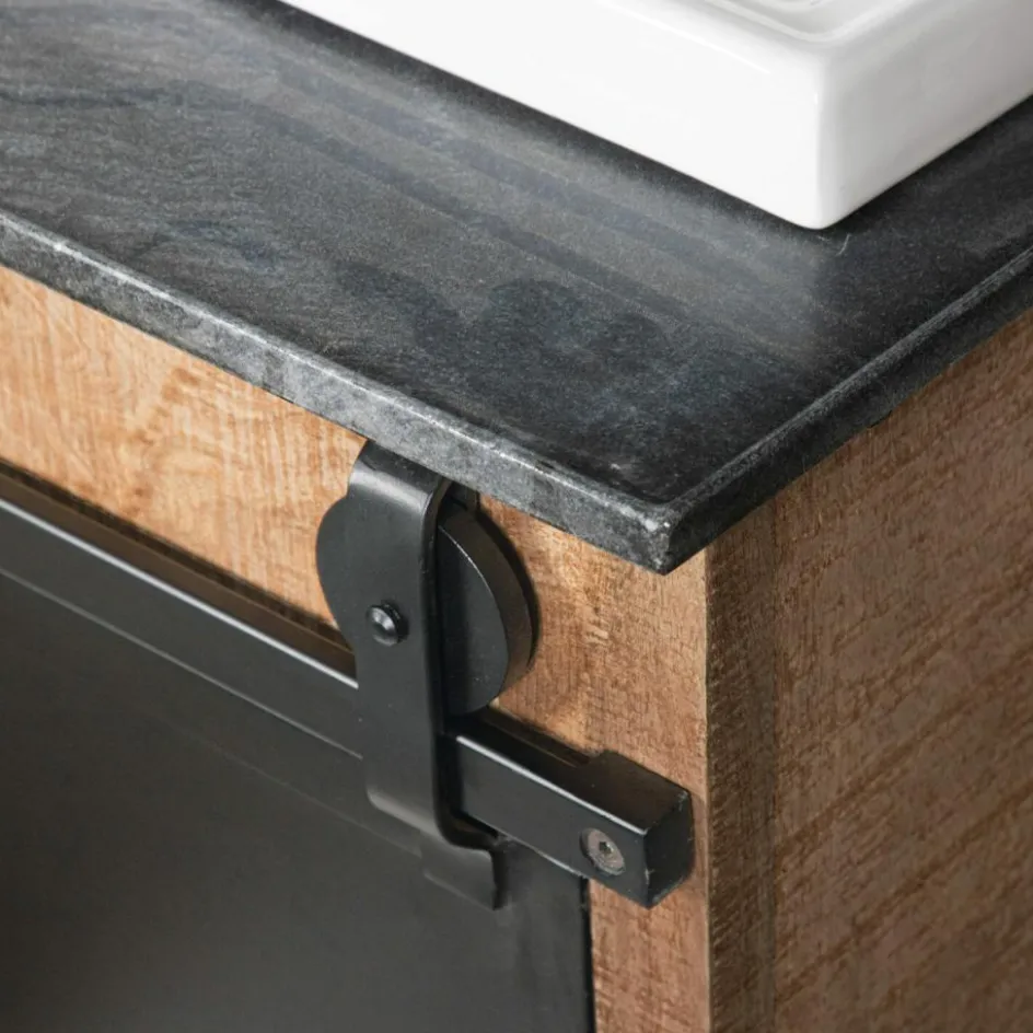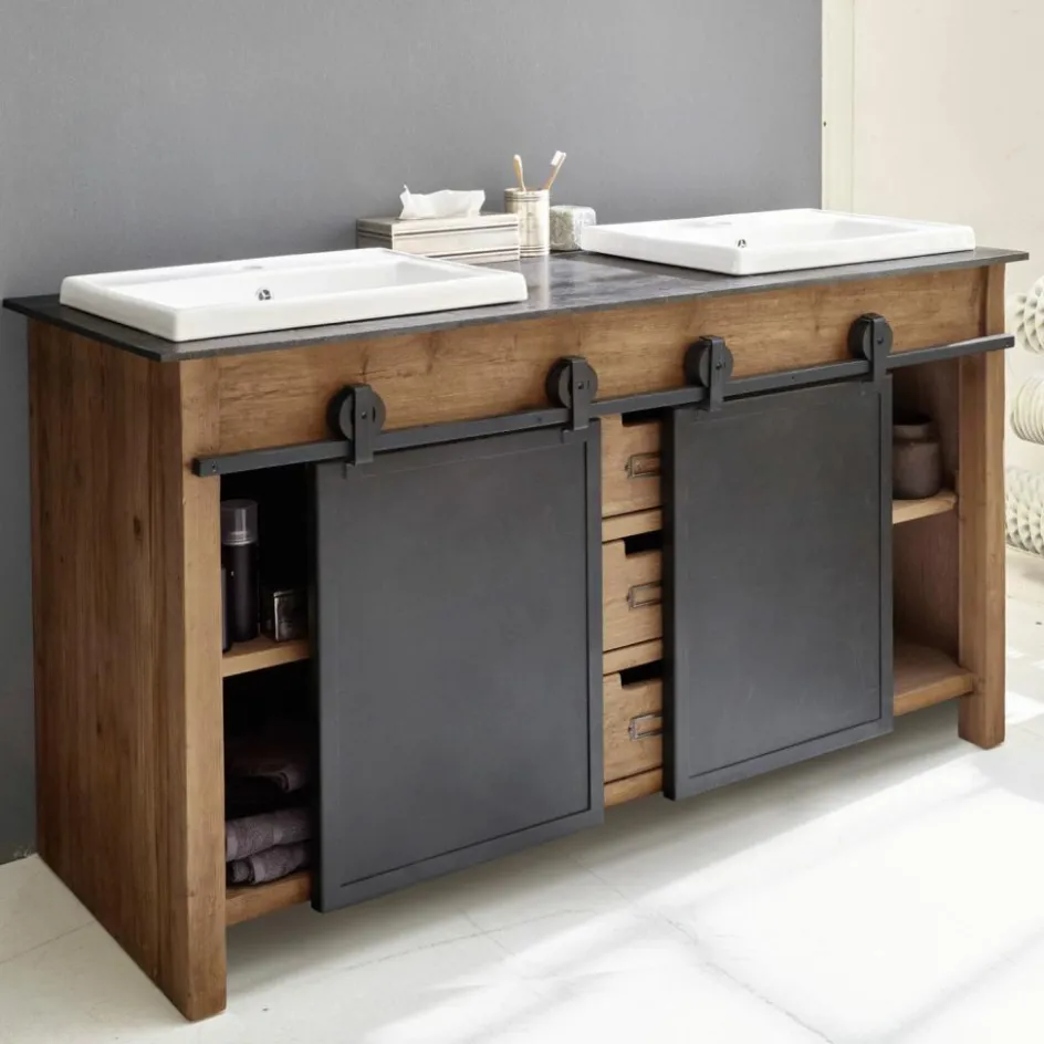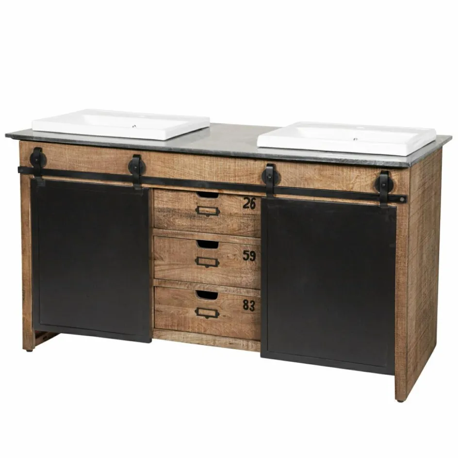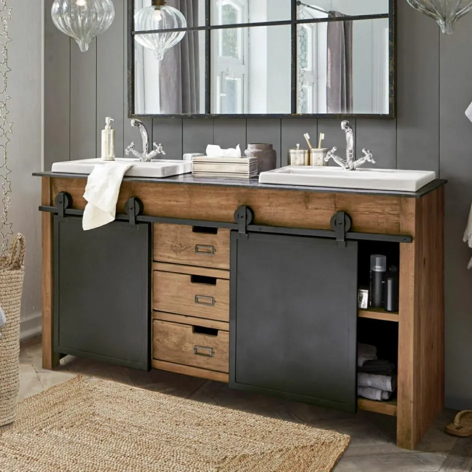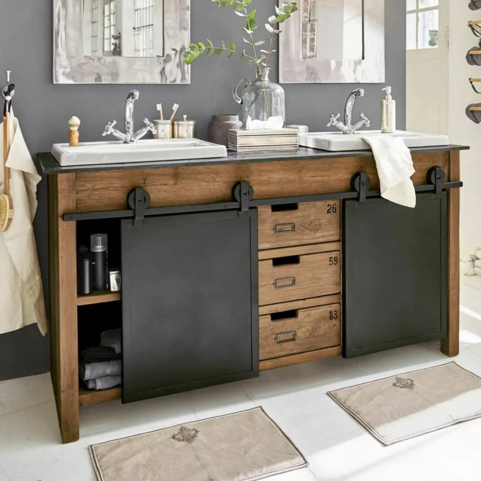 Dieser prächtige Doppelwaschtisch begeistert durch ein funktionelles Vintage-Design, das viel Stauraum bietet und eine stilvolle Bereicherung für jedes Badezimmer darstellt. Das prächtig gemaserte Mangoholz kontrastiert perfekt mit der edlen Marmorplatte und den zeitlos schönen Keramik-Becken. Die prächtige Struktur des Naturholzes wird durch das dezente Finish angenehm intensiviert. Zwei Eisentüren mit außenliegendem Schiebemechanismus stellen ein besonders attraktives Detail dar und drei Schubladen mit Eingriff runden den hochwertigen Gesamteindruck gekonnt ab. Dank der angenehmen Breite können Sie den Waschtisch gemeinsam mit Ihren Liebsten nutzen, ohne sich dabei in die Quere zu kommen. Die großzügig bemesse Oberfläche bietet Ihnen außerdem zahlreiche Möglichkeiten, häufig genutzte Badeutensilien griffbereit abzulegen.