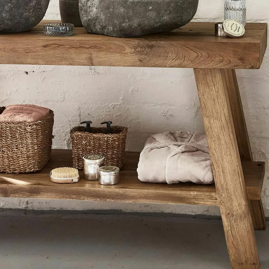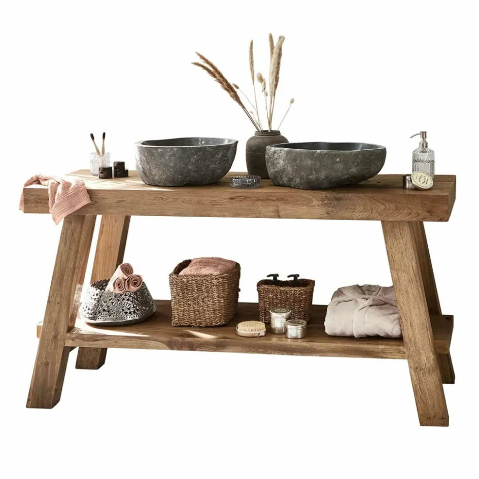 Den Tag am Morgen stilvoll beginnen und am Abend entspannt ausklingen lassen – dafür muss das Badezimmer mit ebenso viel ästhetischem Feingefühl eingerichtet sein wie die Wohnräume. Mit diesem exklusiven Doppelwaschtisch legen Sie die Grundlage für Ihr persönliches Spa. Denn dieser Doppelwaschtisch ist auf der einen Seite ein funktionaler Teil des Badezimmers, auf der anderen Seite aber auch ein Raum-Objekt, das die Schönheit der Natur und die Kunstfertigkeit traditionellen Handwerks vereint. Der Doppelwaschtisch wurde aus hochwertigem Teakholz geschreinert und darf sich im Naturton mit seiner ausdrucksstarken Maserung präsentieren, während der Regalboden als praktische Ablagefläche für Handtücher und Co dient. Das aufsehenerregende Highlight der Kreation sind aber die beiden Aufsatzbecken aus Naturstein. Jedes Becken ist ein kostbares Unikat, das naturgemäß keinem anderen aufs Haar gleicht und dem Doppelwaschtisch noble Exklusivität verleiht. Die Becken zeigen außen die rustikale Natursteinoberfläche, innen sind sie glattpoliert, damit sie gut gereinigt werden können. Jedes Becken hat bereits ein Loch für den Wasserauslauf, in den Teakholztisch muss noch ein entsprechendes Loch gebohrt werden. So können Sie selbst entscheiden, wo Sie die Becken anbringen.